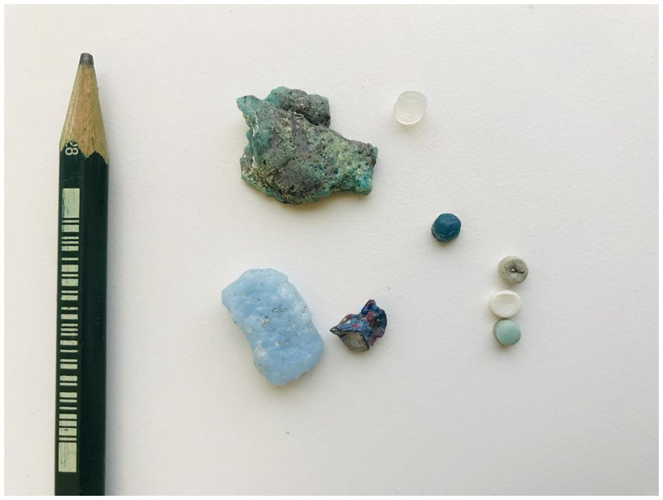 Fragments of pyroplastic on the left and pre-production pellets (“nurdles”) on the right (author's photograph).
