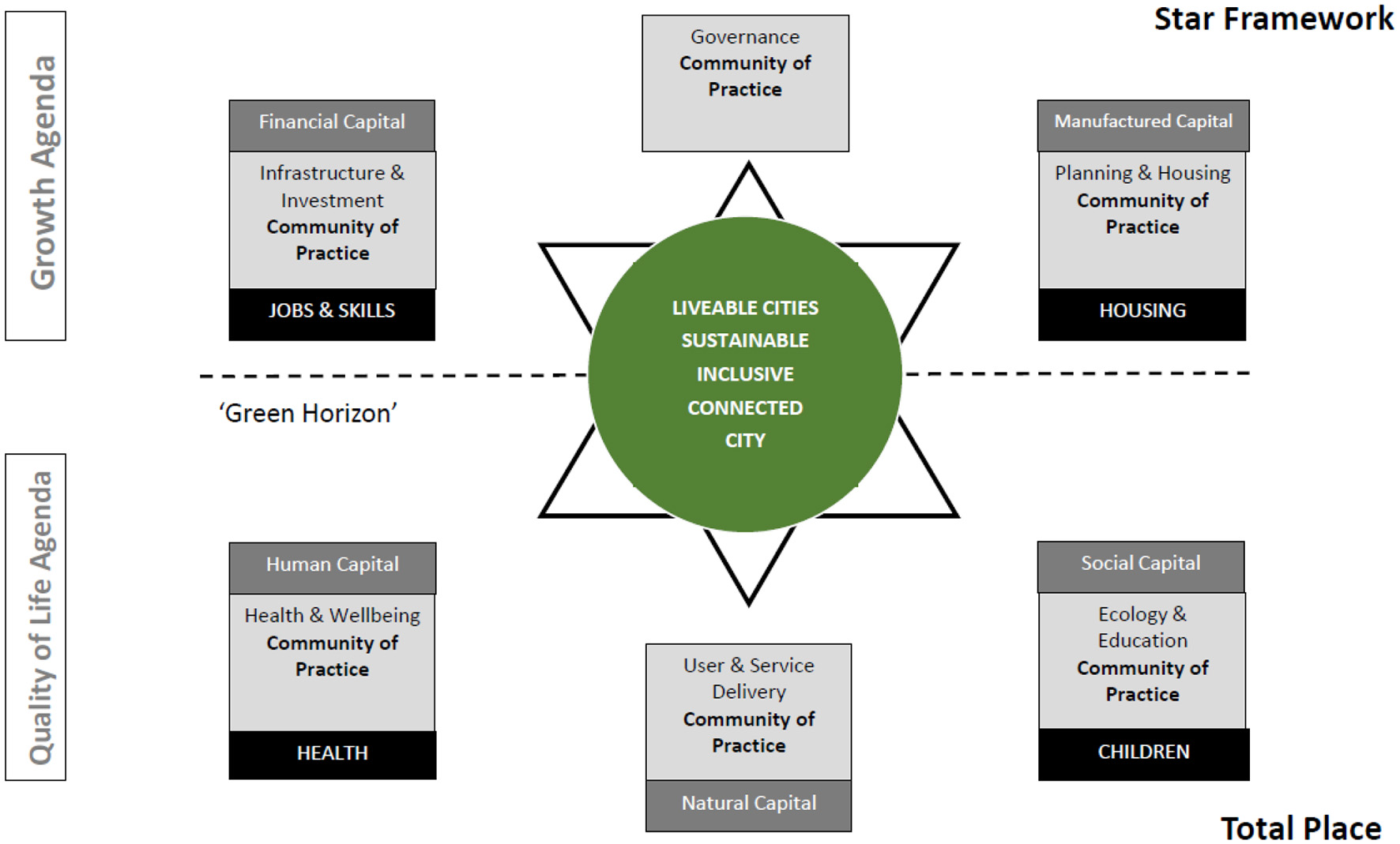 The process outlined at the start of Section 3 was applied to formulate the Star Framework by interpreting the evidence base in terms of the five Natural Capitals (points 1 and 2 of the logical sequence for transforming governance). Articulating the research findings, and notably the benefits deriving from them, in terms of the aspirations and policies being adopted by each of those responsible for leading on, and delivering the necessary outcomes from, the City's four priorities (Housing, Children, Health and Jobs & Skills) formed the essential transformative step. They, on behalf of the City, had to be persuaded to trial the thinking (point 3) and observe the benefits (point 4). This needed bold vision and leadership within the City Council, and this was readily forthcoming once the benefits of doing so were made clear.