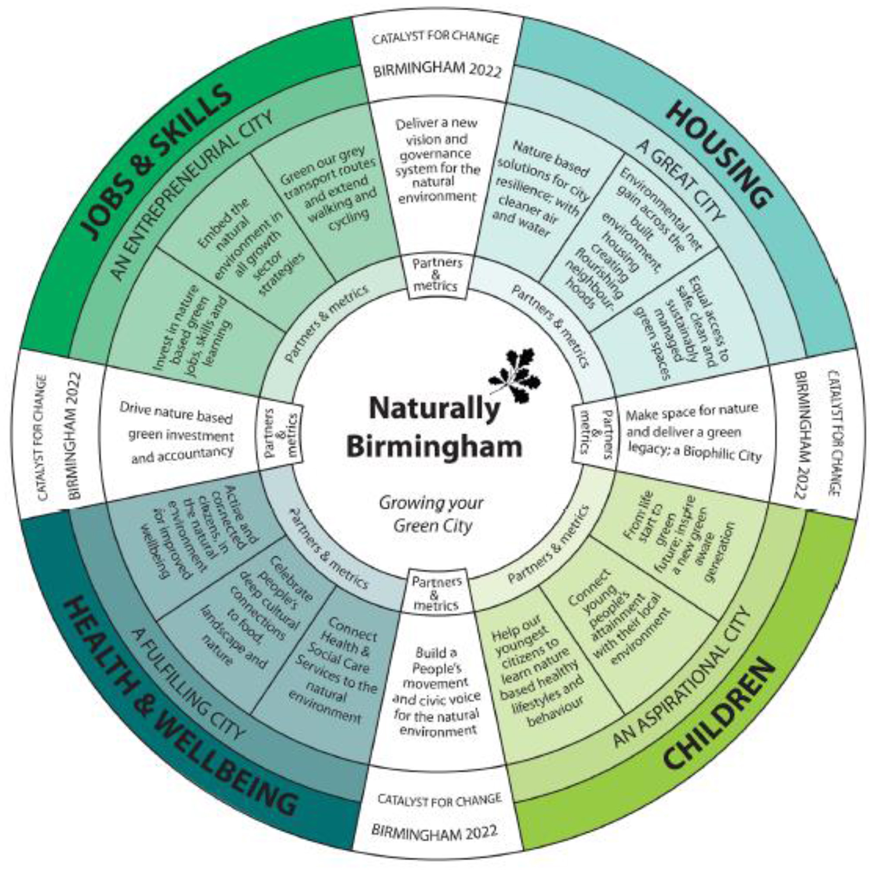 Echoing the five cities model advocated by the Liveable Cities programme – an ‘ideal city' would constitute a synthesis of a courteous city, an evolving city, a healthy city, the city as a public space, and an active and inclusive city (Ortegon-Sanchez and Tyler, 2016; Leach et al., 2020) – ‘Naturally Birmingham' has likewise identified five components that need to be synthesised in its overarching vision for Birmingham as a City of Nature. These are:
