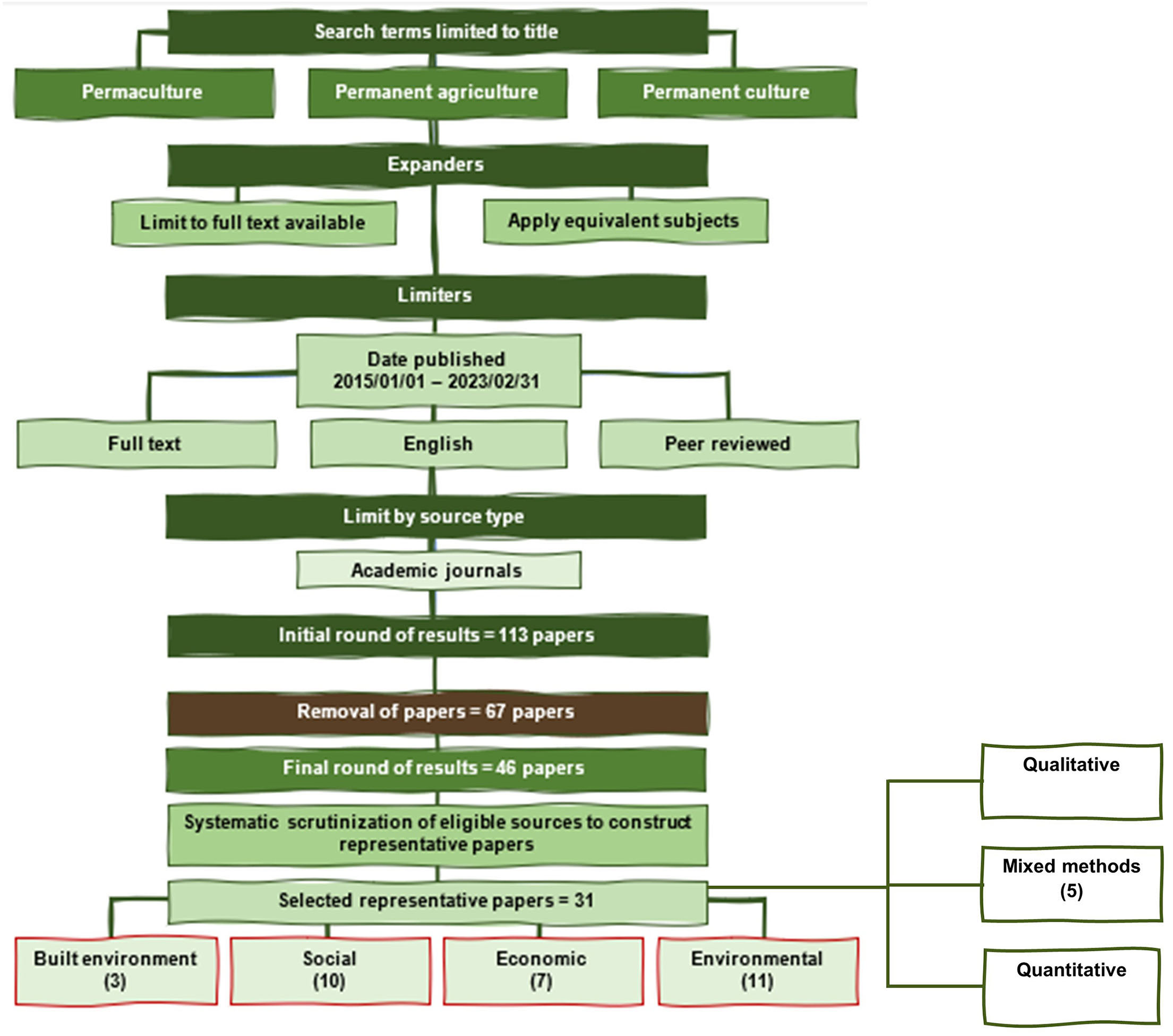 The solid foundation and specified nomenclature of permaculture made locating relevant papers relatively easy. To ensure a comprehensive search, the terms “permanent agriculture” and “permanent culture” were included with the same limiting factors as “permaculture.” These limiting factors included full-text papers available in English only and published in peer-reviewed academic journals. The decision to use peer-reviewed papers was because their literature holds the most significance and accuracy in scientific publications. Only research papers that were published in academic journals were considered in the search to ensure authenticity and validity. The time span of the research was limited to 2015–2021 to ensure a scoping review that is informed by recent findings. Other exclusion3 criteria included research that was not conducted from perspectives relevant to this study (social, environmental, business, or spatial perspectives) or studies that fell within saturated discussions of permaculture e.g., many studies have explored permaculture as a land regeneration tool. Thus, a certain number of articles were selected to represent a saturated phenomenon in this review. A comprehensive search was conducted across several academic databases, including Science Direct, Scopus, Sage, Directory of Open Access Journals, Web of Science, and Google Scholar.