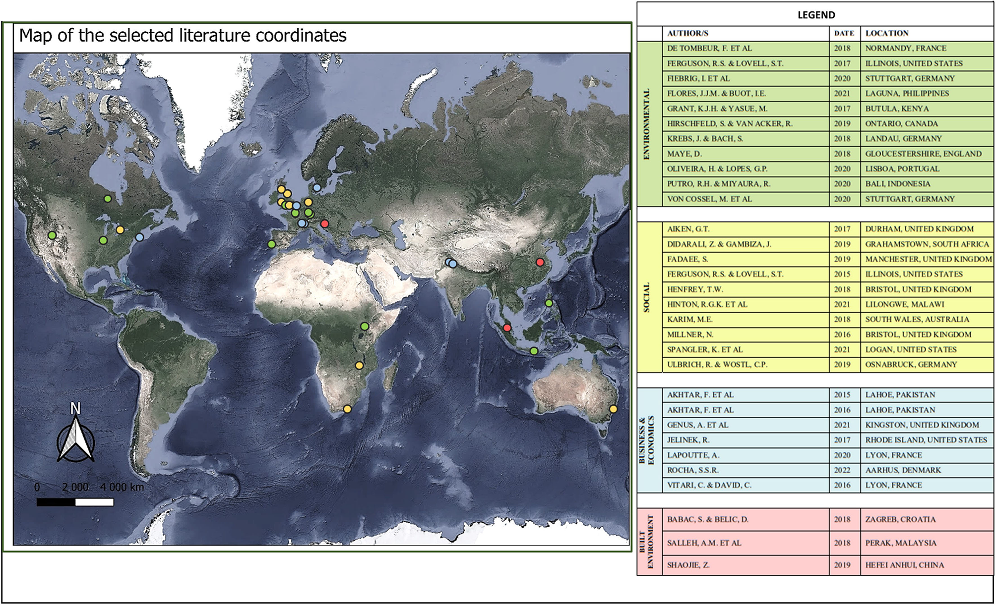 Figures 2, 3 illustrate the structural findings of this study, including the locality, perspectives, and research methods used in the selected literature. In Figure 2, it is illustrated that 67% of the studies presented in the literature used a qualitative research approach, 16% a quantitative approach, and the remaining 17% a mixed-methods approach. The geographical distribution of the studies conducted is presented in Figure 3, with green indicating studies that focus on environmental perspectives, yellow on social perspectives, blue on business and economic perspectives, and red on built-environment perspectives. Figure 3 provides a visual overview of the diverse perspectives and approaches used in permaculture scholarship. When examining the perspectives and the distribution of the selected literature, as depicted in Figure 3, we can already see how permaculture's multifaceted nature demonstrates its ability to be applied in the wide array of environmental, social, and economic context. Three primary focuses in permaculture emerged from the scoping review: (i) an environmental focus, (ii) a social focus, and (iii) an economic focus. These focuses revolve around key concepts of permaculture that have been investigated in various contexts. The relation between the themes that are identified in the literature and urban planning is considered to address the purpose and research question as provided in the introductory section of this paper.
