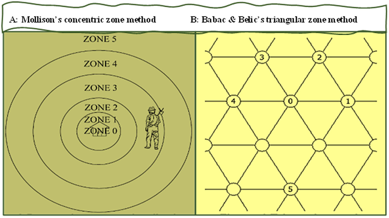 (A) Mollisons' concentric zoning method for a PC system. (B) Babac & Belic's triangular zoning methos for a PC system. Source: Mollison and Holmgren (1990) and Babac and Belic (2018, p. 106–108).