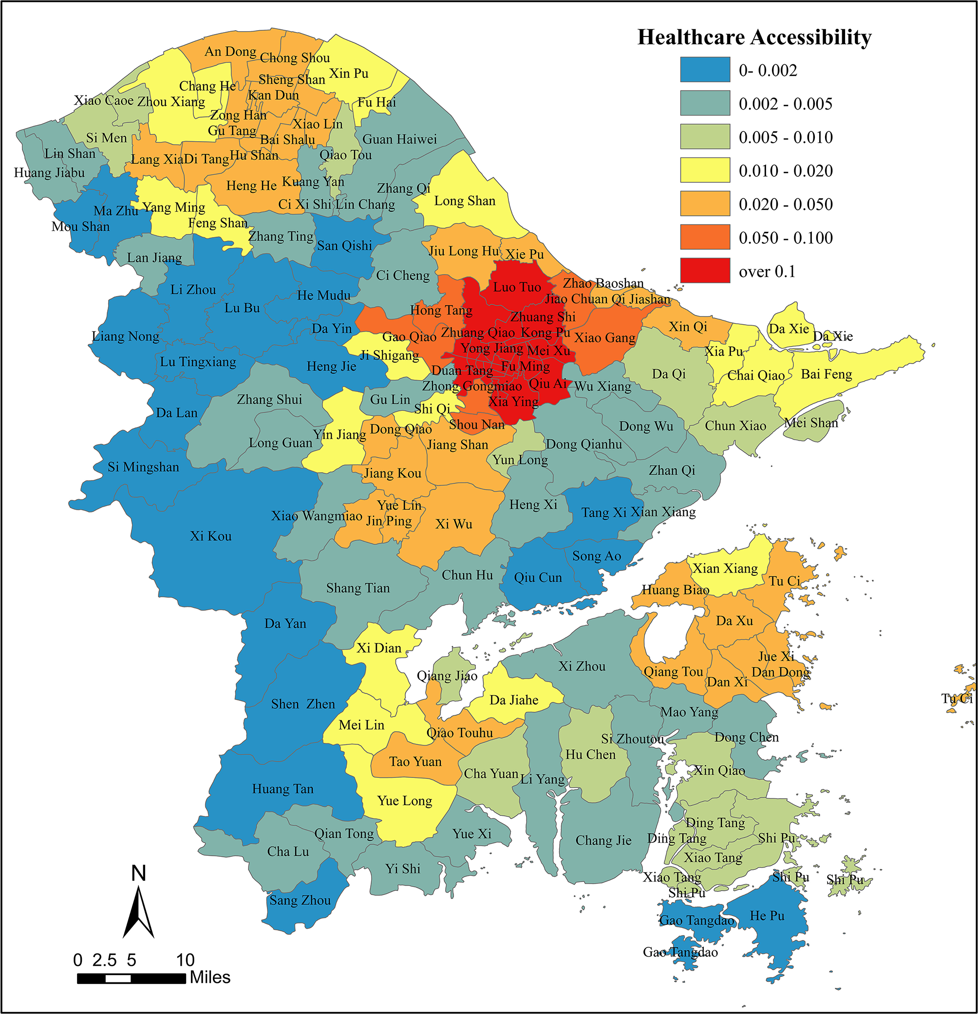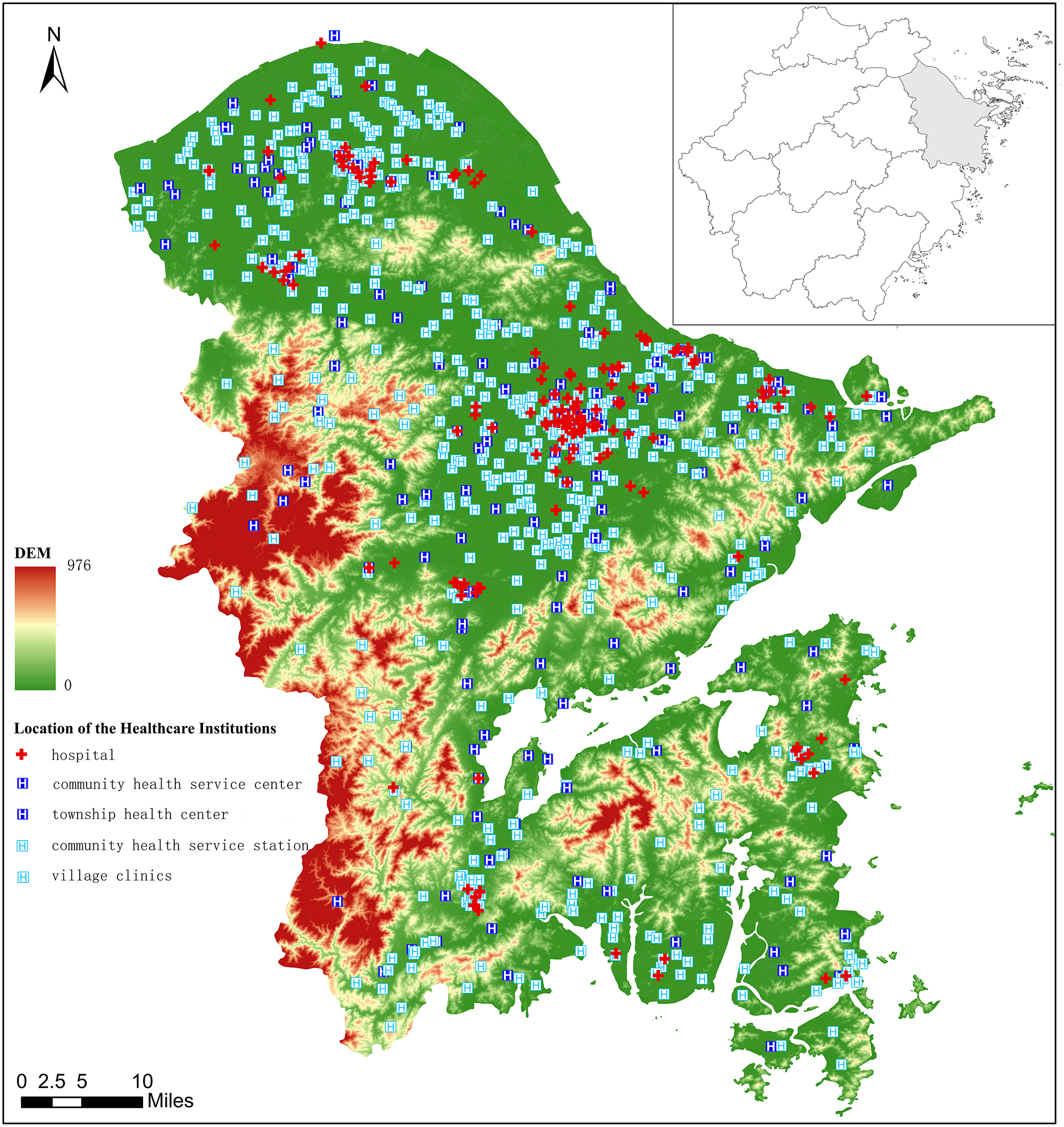 The distribution of muti-level healthcare institutions in Ningbo.