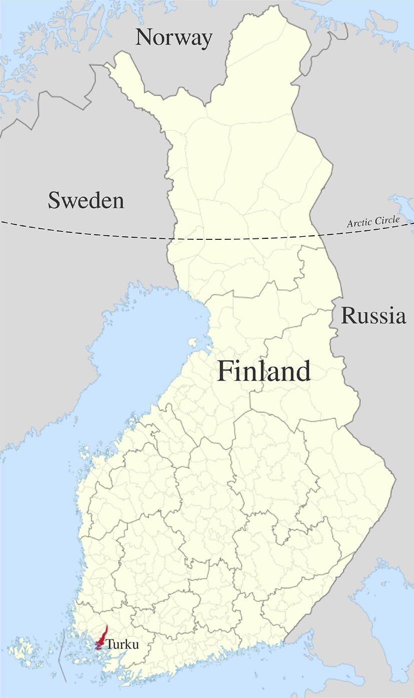 The city of Turku is located on the shore of the Baltic Sea in southwestern Finland in Northern Europe. The background map was originally sourced from Wikipedia under the CC BY-SA 3.0 license and has been modified to suit the specific needs of this illustration. Credit for the original map creation goes to Fenn-O-maniC, as required by the license terms.