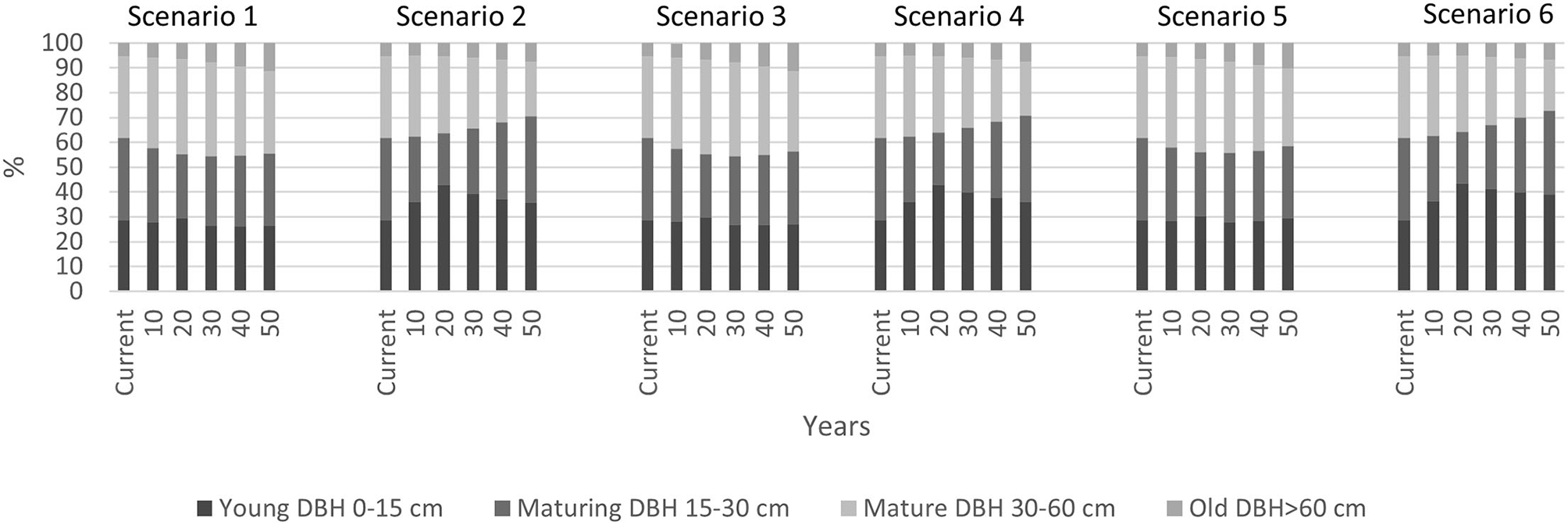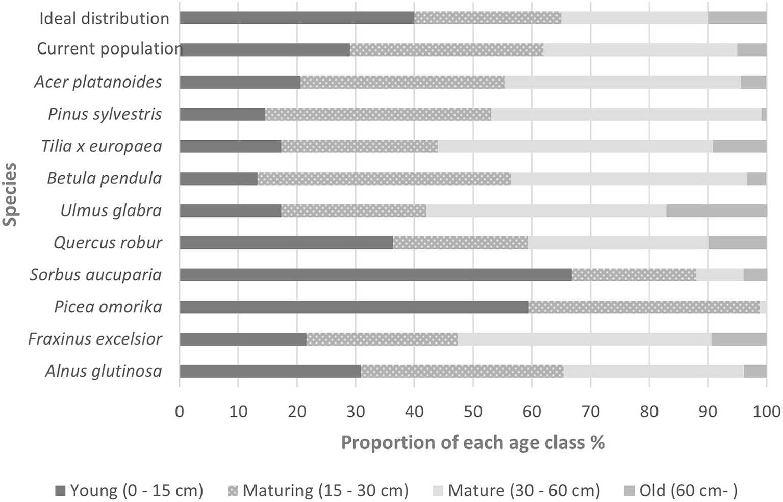 Several studies have proposed ideal structural distributions for an urban forest based on the diameter at breast height (DBH at 1.3 m) as an indicator of age (Richards, 1983; Millward and Sabir, 2010). We used the distribution classes proposed by Wang et al. (2018). In the ideal structural distribution, the target proportions are 40% for young trees (DBH 0–15 cm), 25% for maturing trees (DBH 15–30 cm), 25% for mature trees (DBH 30–60 cm), and 10% for old trees (DBH > 60 cm).