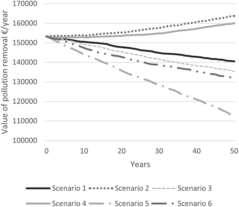 The annual number of trees planted was based on the tree planting data collected over the last 10 years in Turku. The average number of new park and street trees planted each year is 432, which is ~1.3% of the total tree number of park and street trees (see text footnote 1). Since the study data included trees growing on public plots in addition to park and street trees, the 1.3% planting rate would mean 500 trees annually for all public trees. Consequently, the annual tree planting rate was set to 500 for the current planting rate scenarios (scenarios 1, 3, 5) and to 1,000 for scenarios in which the planting rate was doubled (scenarios 2, 4, 6).
