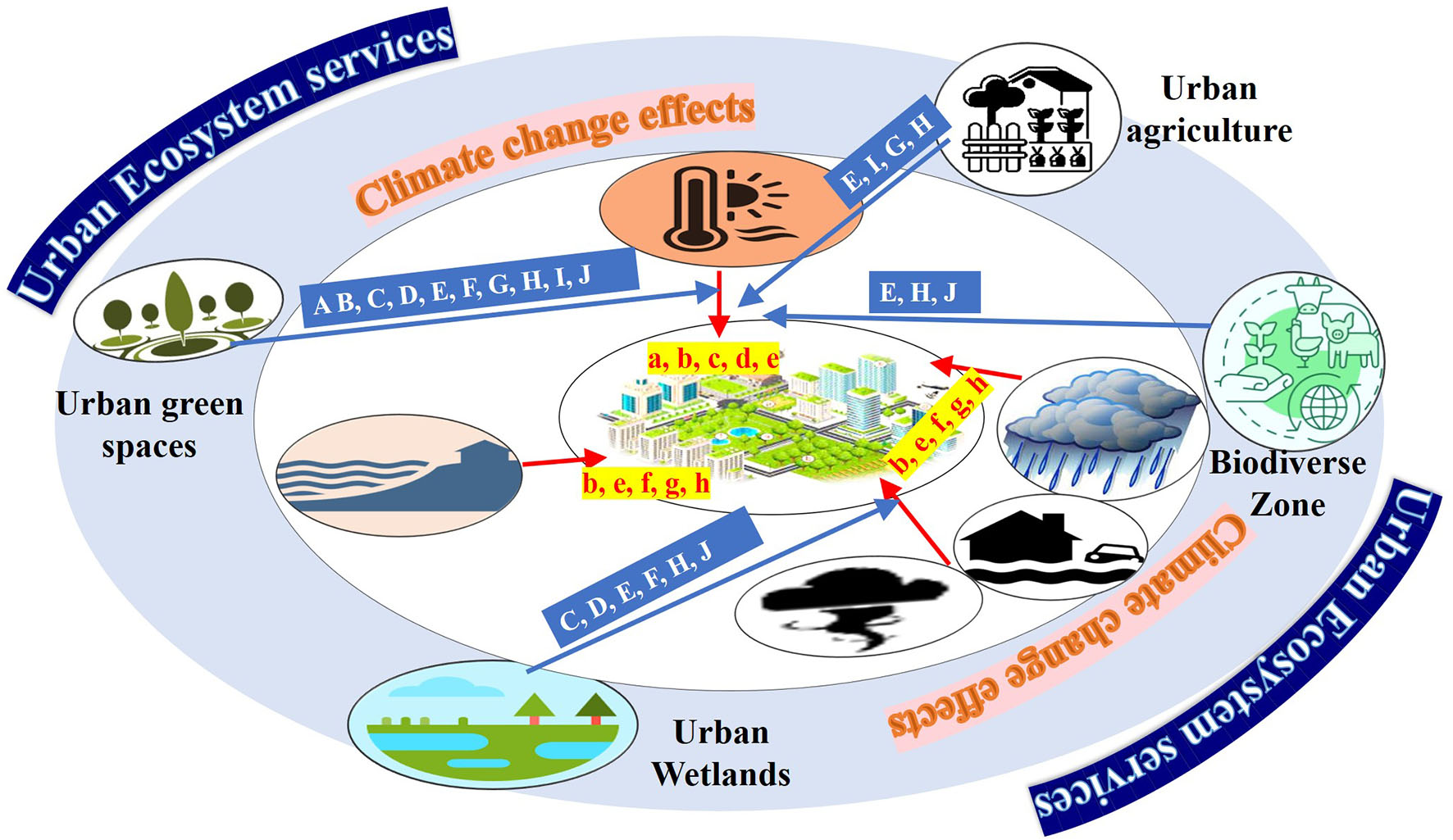 An illustrative portrayal showcasing the dynamic interplay between urban ecosystem services and climate change which serves as a powerful tool for communicating intricate connections. Within this representation, blue arrows signify the ways in which urban ecosystem services act as a buffer, alleviating the effects of climate change. Conversely, red arrows depict how climate change acts as a stressor, imposing strains on the delicate balance of the urban ecosystem. A, temperature regulation; B, air quality control; C, stormwater management/flood water absorption; D, flood mitigation; E, biodiversity support; F, carbon sequestration; G, pollination services; H, cultural services; I, food security; J, climate resilience; a, urban heat island/global warming; b, loss of cultural services; c, air pollution; d, biodiversity loss; e, less carbon sequestration; f, flooding; g, affected pollination; h, food insecurity.