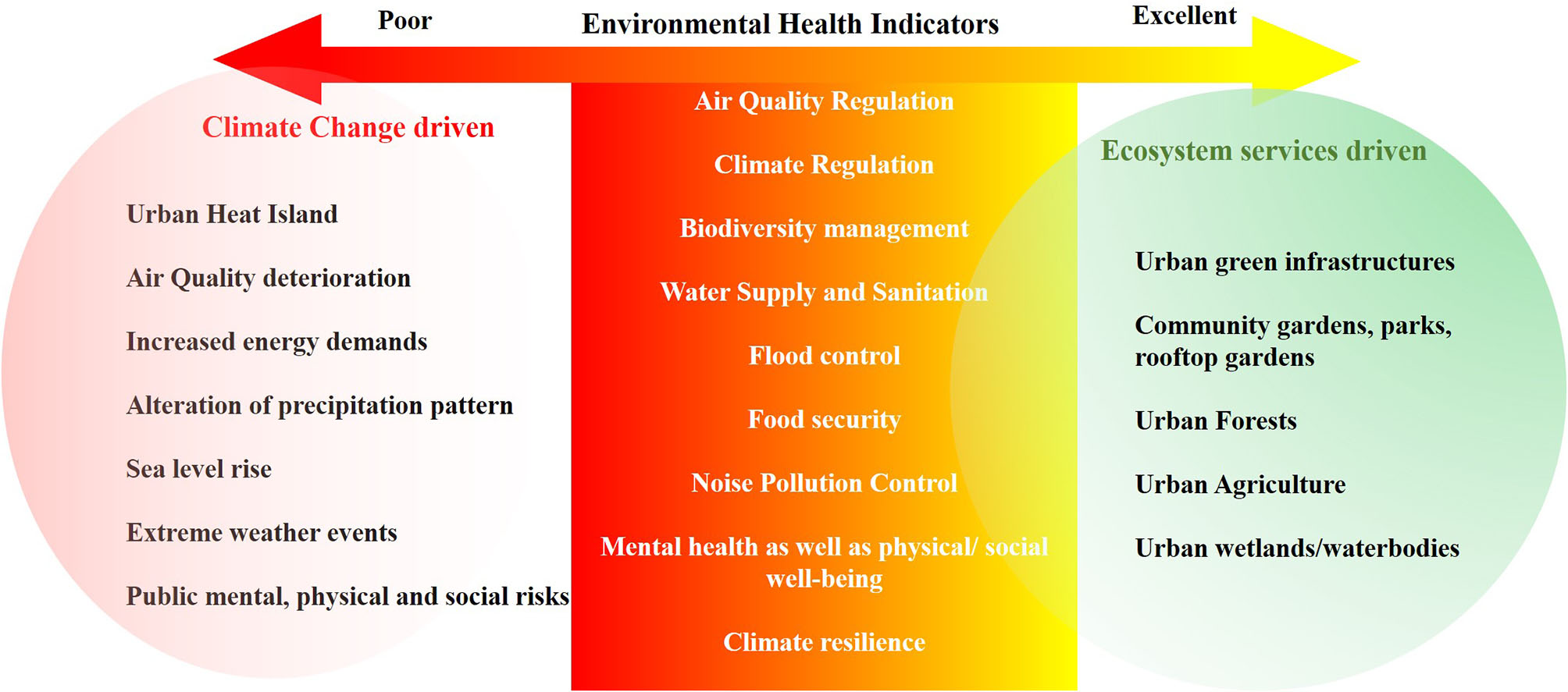 In mainstream concept, ecosystem services have been merely divided into four categories according to the classification offered by the Millennium Ecosystem Assessment (2005) regulatory, provisioning, cultural, and supporting services. Several researchers have proposed more detailed classifications of ecosystem services specifically tailored to urban environments. In a pioneering study by Bolund and Hunhammar (1999), they introduced a straightforward categorization of ecosystem services that are distinct to urban ecosystems and environments. Their research emphasized the numerous benefits that urban green infrastructure offers to human health. These benefits include micro-climatic control, air purification, acoustic attenuation, rainwater harvesting, effluent treatment, and aesthetic values. However, the delicate balance between these urban ecosystem services is being disrupted by the far-reaching impacts of climate change. Rising temperatures, altered precipitation patterns, sea-level rise, and more frequent extreme weather events pose significant challenges to the functioning and resilience of urban ecosystems. Moreover, there have been noticeable changes over time including the rapid reduction of ozone in the stratosphere, the expansion of desert areas, the loss of forests, excessive deposition of nitrogen in the atmosphere, a reduction in freshwater resources, shifts in land use patterns, and biotic interchanges (Thuiller, 2007).