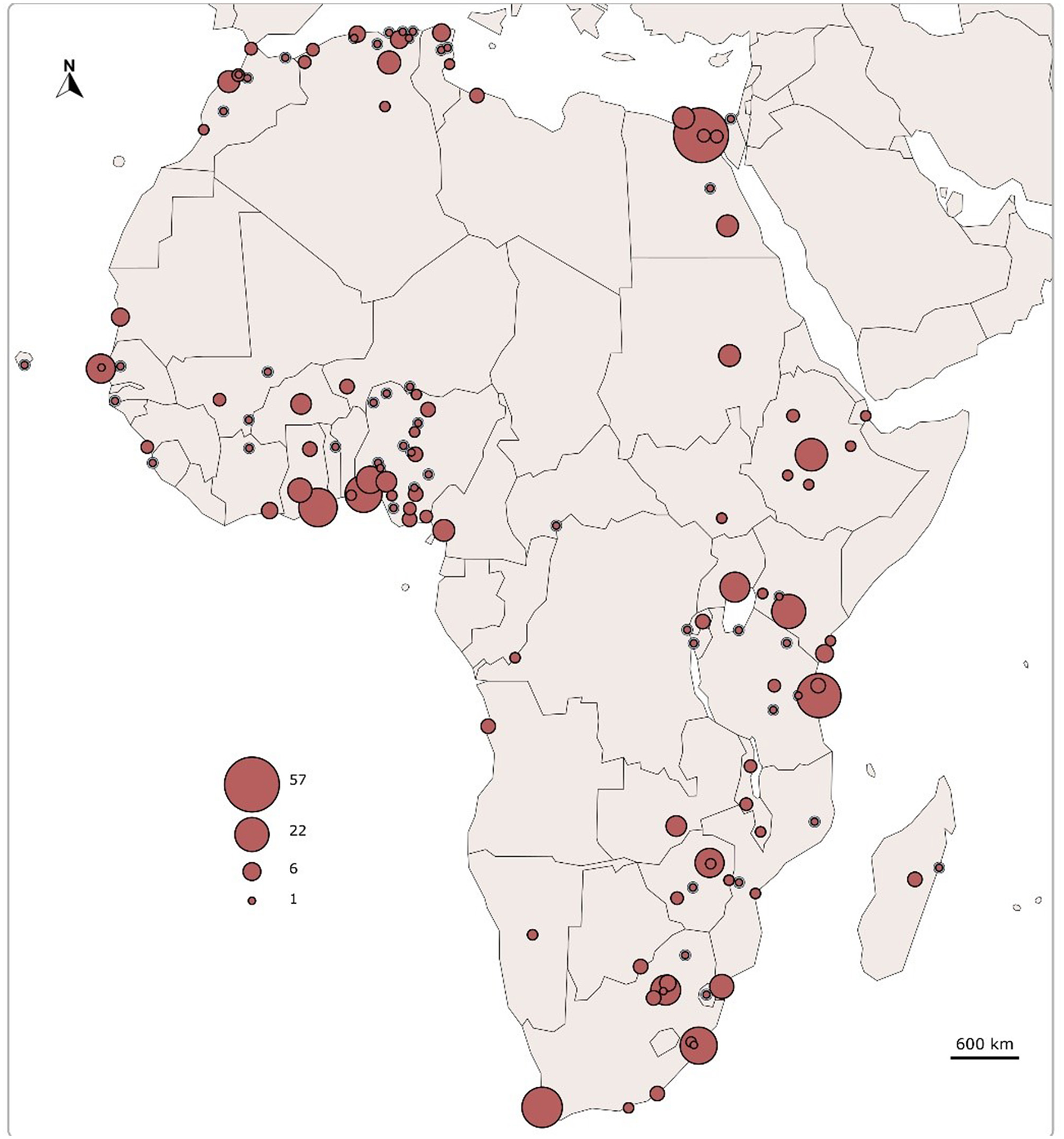 What map of occurrence frequencies do we obtain by searching for city names? We notice that four African cities with more than 100,000 inhabitants have namesakes in other countries located in North America, Europe or Oceania (see Table 2). The occurrence of these city names in the metadata without occurrence of the corresponding African country name, gives rise to a direct reading of the metadata in order to discard irrelevant detections (false positives; also see above the case of the city of Man). Names of African cities without namesakes are found in 520 occurrences with their respective country names, as well as in 221 occurrences without mention of the country. Thirteen occurrences of homonymous towns with their country were also found during text mining.
