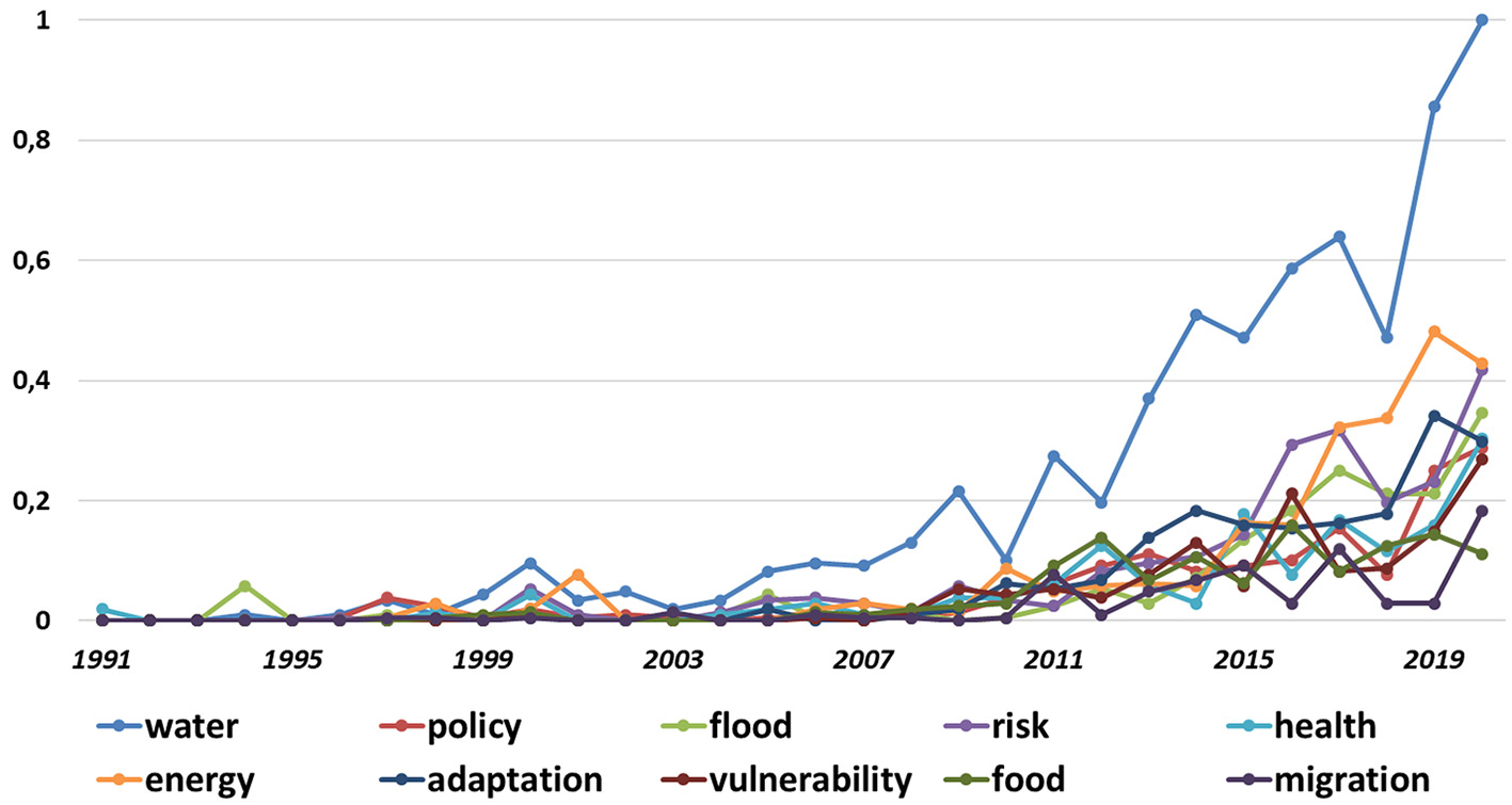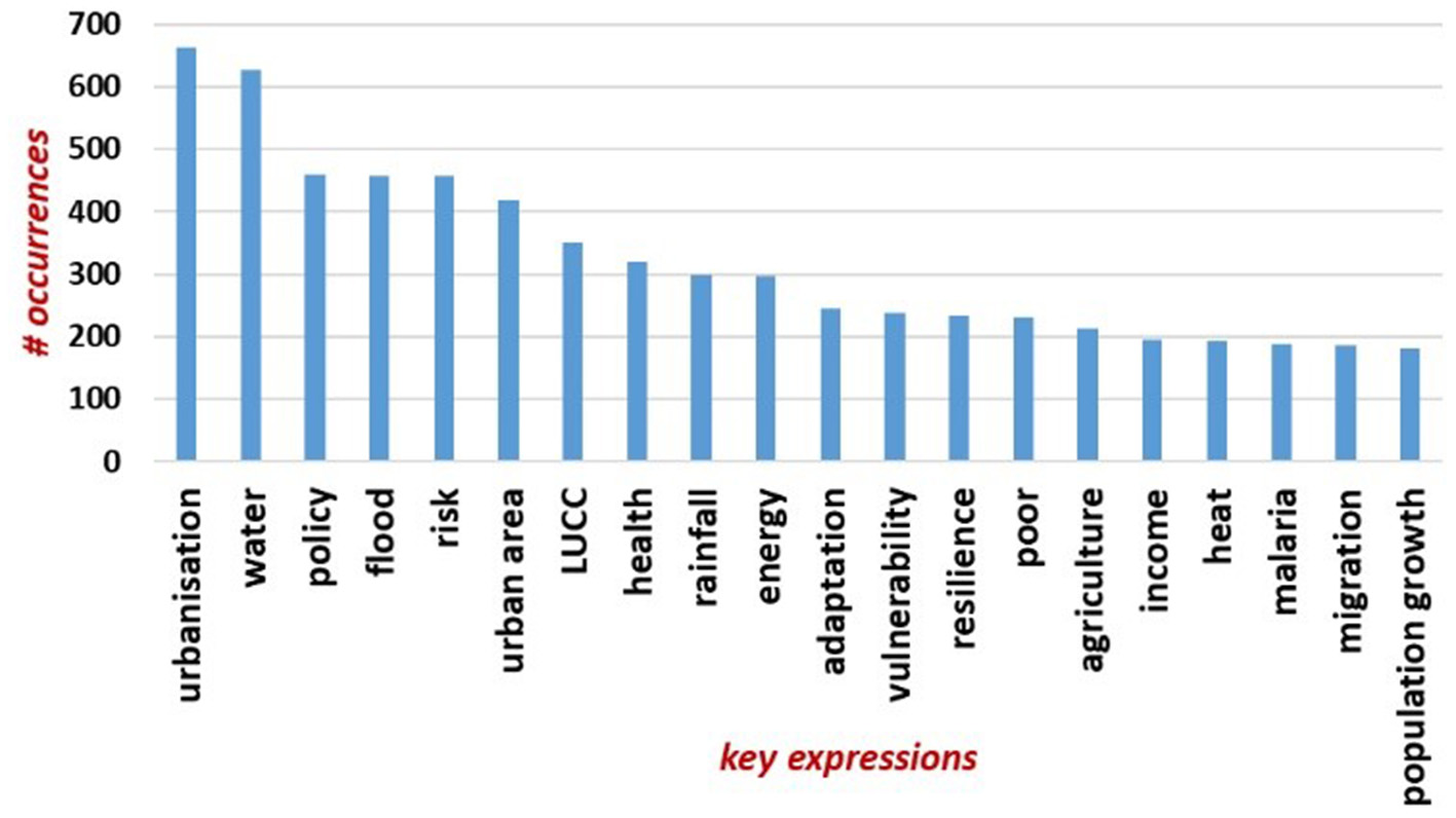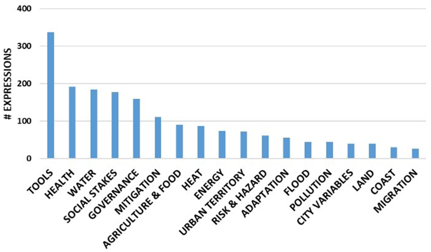 Climate change affects all ecosystem compartments, all renewable natural resources (among which we include water here, even if this is a shortcut with regard to, for example, fossil groundwater in the Saharan zone). Equally rare are productive human activities or environmental living conditions that are not affected. A kind of hierarchy of issues emerges through the analysis of the frequencies of occurrence of key expressions grouped by theme. The distribution of key expressions subsumed under each issue of the taxonomy is shown in Figure 2 (see also the Appendix).