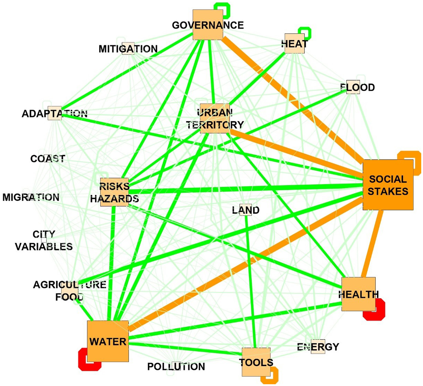 In order to visualize the way in which the scientific articles address the various issues identified previously and link them in the analyses they propose, a graph is built whose vertices are the eighteen issues or themes (Figure 3). A link of weight w = n is drawn between two vertices if key expressions of each of the corresponding issues appear in the metadata of n articles. A self-loop of weight w = n on a vertex represents the cases where only expressions of the corresponding issue appear in the metadata of n articles. In Figure 3, the size of a vertex is proportional to the sum of the weights of its links. The graph obtained organizes the information contained in the metadata corpus and derives directly from the rule for linking classes of key expressions, these classes designating major issues of urban climate change (see Appendix). Some of the useful-to-know characteristics of the graph-such as the centralities-are estimated with the NetworkX library (Hagberg et al., 2020) and the plotting uses the general-purpose diagramming program yEd (yWorks GmbH, 2020).