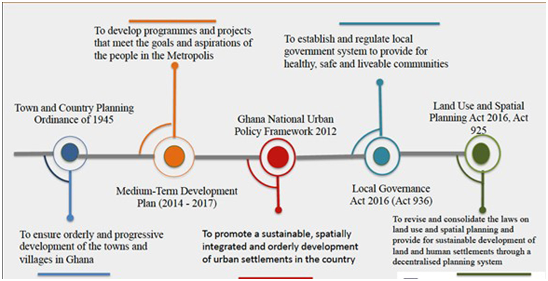 Furthermore, the Assembly's Medium-Term Development Plan for 2014–2017 aims to create programmes and projects that align with the goals and aspirations of the local people. Additionally, the National Urban Policy Framework 2012 aims to promote sustainable, orderly development of urban settlements, providing adequate housing and services, efficient institutions, and a sound living and working environment for all people to support Ghana's socio-economic growth. The document acknowledges explicitly that:
