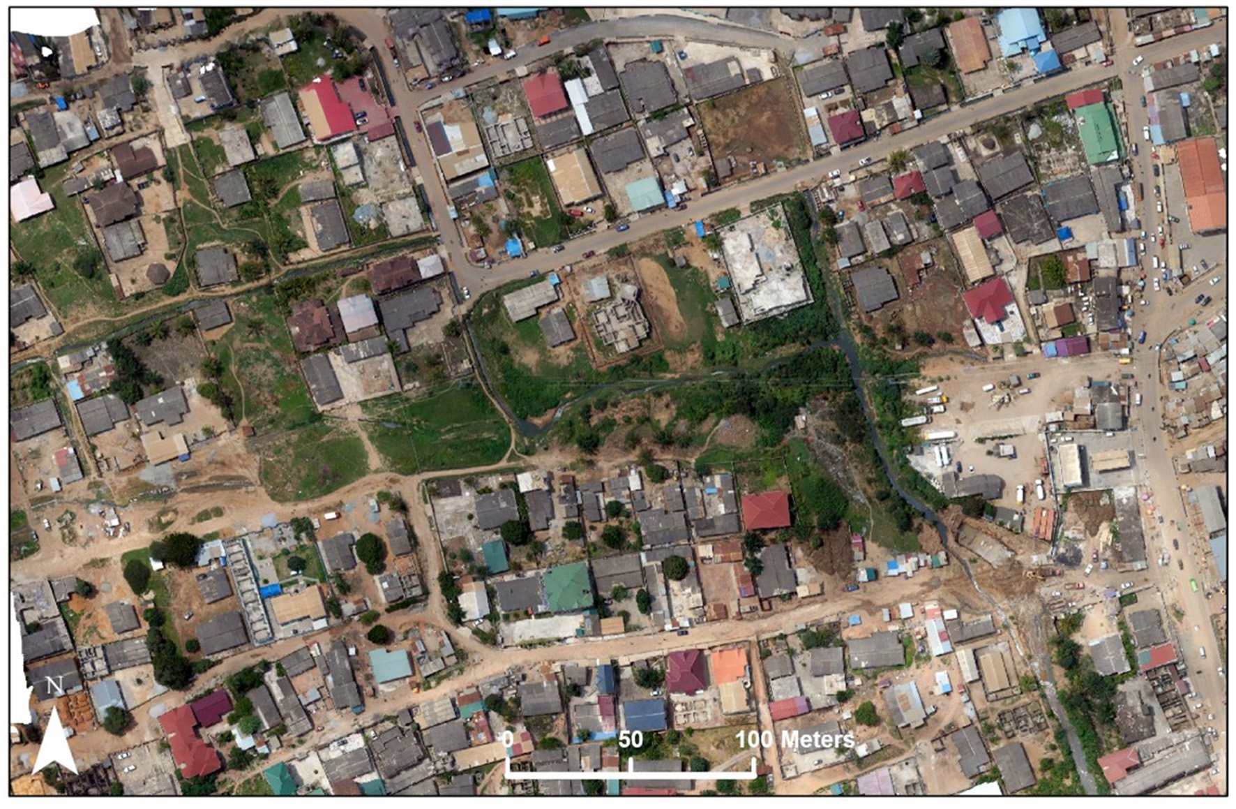 These risks are due to the rapid urbanization, growth of informal settlements, poor urban governance, and deteriorating ecosystems, all of which are aided and reinforced by the settlement's geographical location (in a syncline). Thus, the orthophoto, created from RGB images from uncrewed aerial vehicle (UAV) applications (see Figure 3), illustrates the haphazard and chaotic nature of the area's development crossed by a natural stream. Buildings near and in the waterway and barriers created by clogged drains and narrow bridges provide the basis for frequent flooding and, hence, the rush for individual actions that affect other areas negatively. Additionally, since a significant portion of the population engages in informal business and trading activities in central Accra, localized disasters significantly impact the creation of green space deserts, residents' mobility patterns, and livelihoods due to climate change.