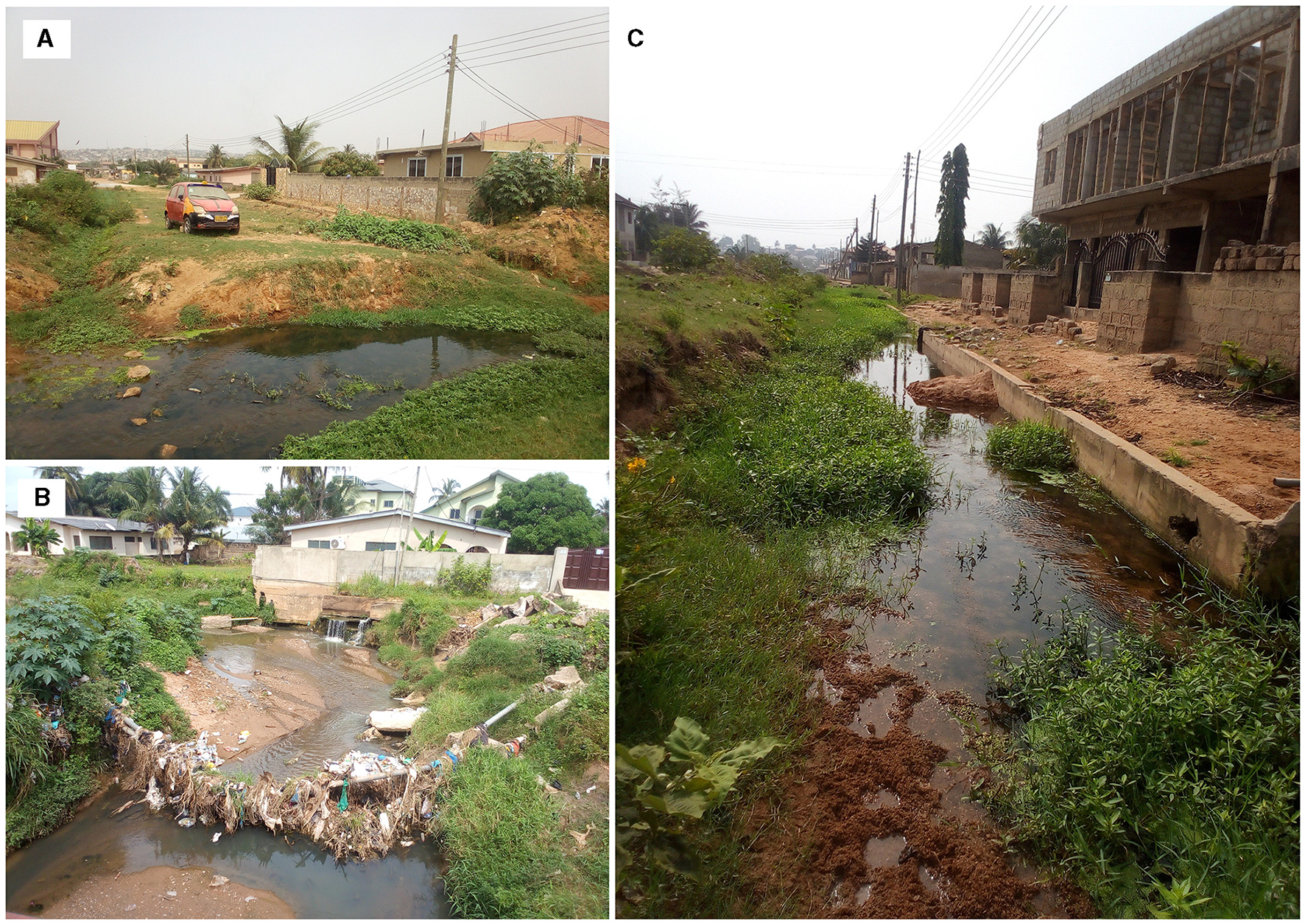 Samples of residents building labeled (A–C) all situated near waterway. Source: Authors' fieldwork.