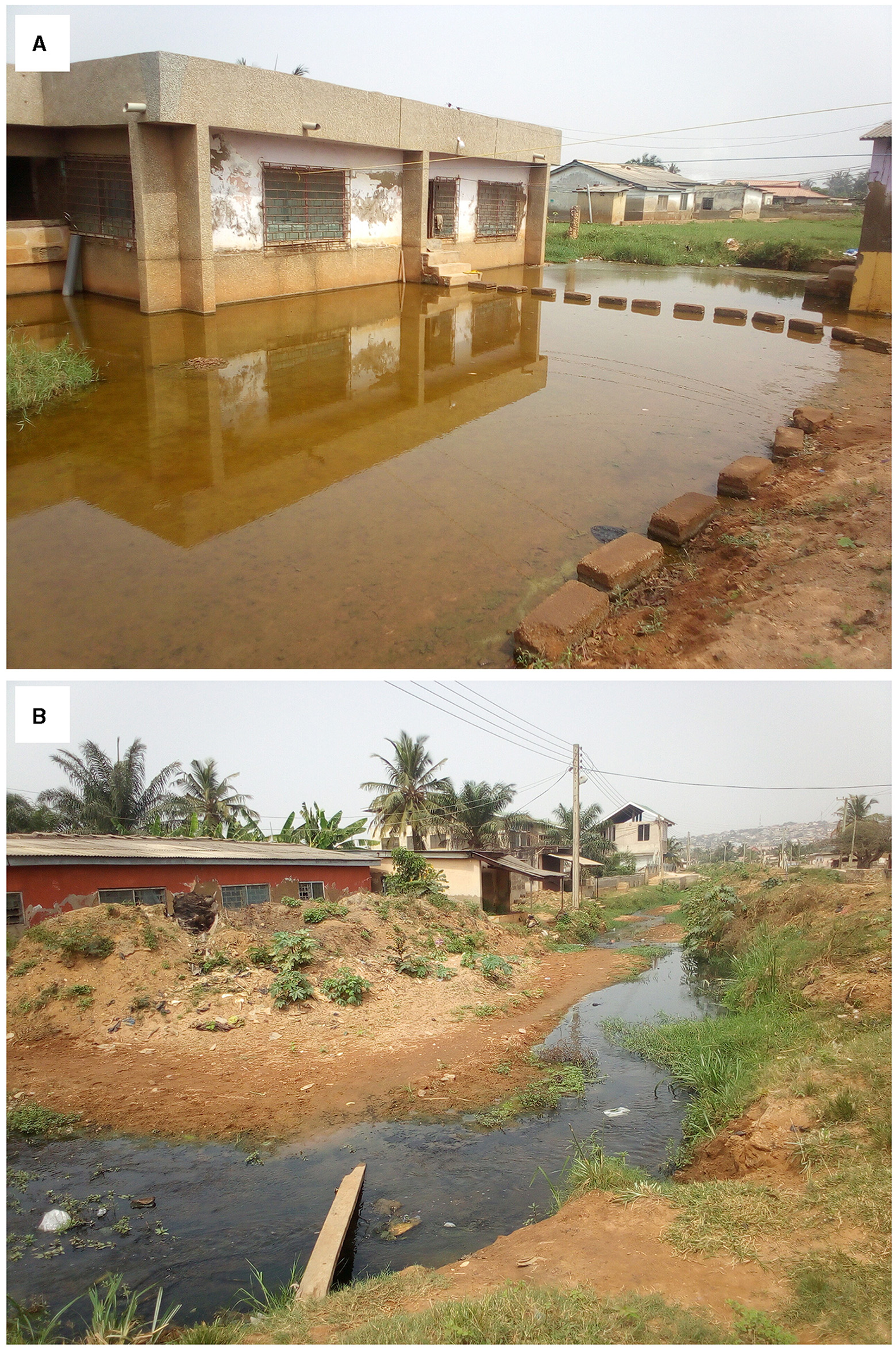 Most open spaces in Santa Maria, including residential, (A, B) are flood-prone. Source: Authors' fieldwork.