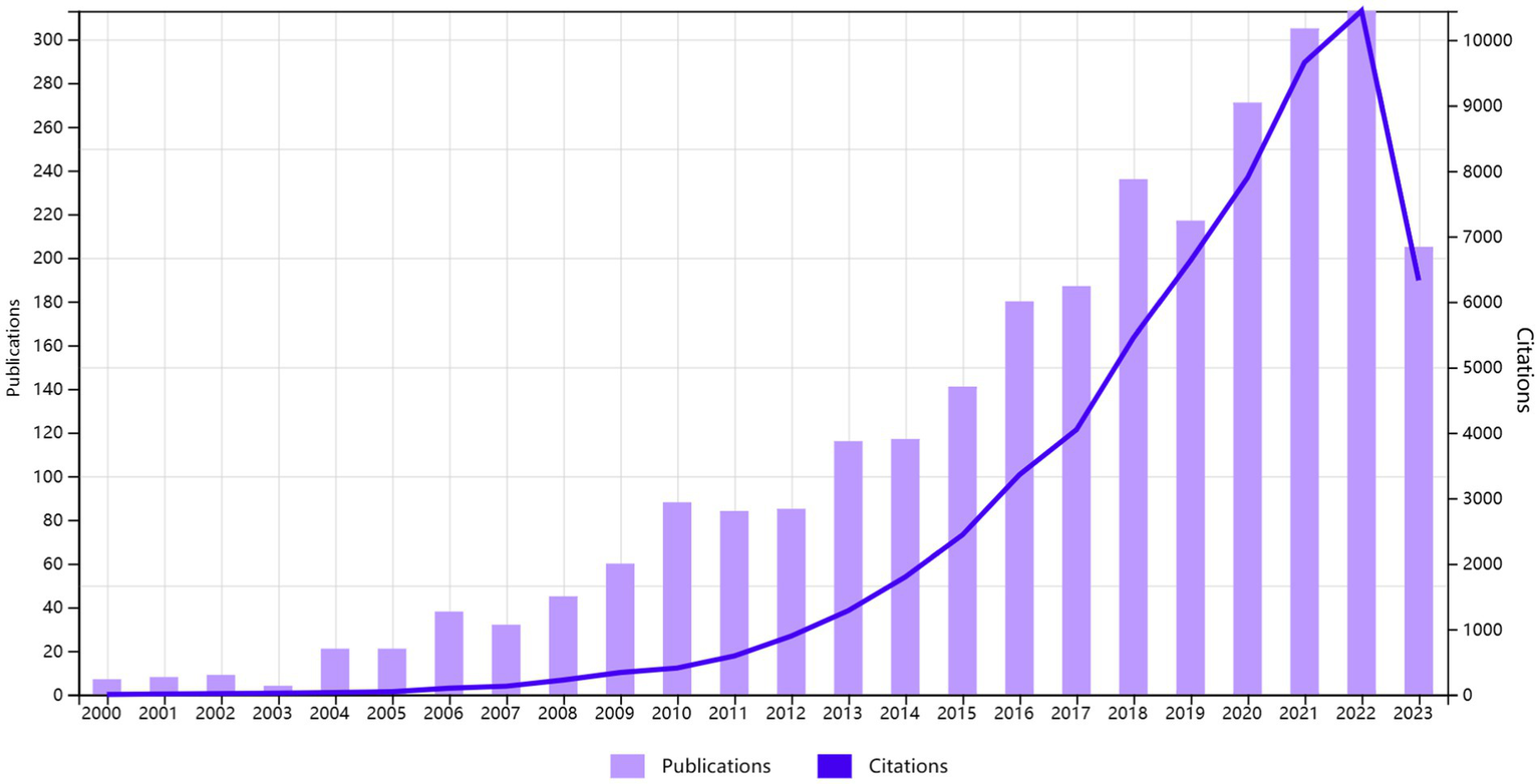 With the rapid development of urban construction and the completion of the industrial revolution, global urbanization has now covered a significant portion of the world’s population (United Nations, 2016; Kiviaho and Einolander, 2023). Urban communities have gradually emerged as the primary carriers of security (Patel and Burkle, 2012; Elfversson and Höglund, 2023). Urban community security has consistently been a focal topic in the fields of urban planning and social policy (Contardo et al., 2023). The initial research on urban community security can be traced back to the evolution of crime from the 1960s to the 1990s, a period when urban crime rates around the world exhibited exponential growth (Findlay, 1999). In recent years, global climate change has led to various risks for urban communities, including frequent extreme weather events (Ghosh et al., 2021; Li et al., 2021; Yang et al., 2023), global infectious diseases (Korkietpitak et al., 2013; Nova et al., 2022), natural disasters (Rus et al., 2018; Xiang et al., 2018), and urbanization issues (Colozza et al., 2023). The notion of community resilience is gaining popularity due to its potential to provide tools for risk preparation, as well as deal with and recover from the consequences of disasters (Elkady et al., 2023). Accordingly, scholars have built a food system (Menconi et al., 2022), water security system (Varady et al., 2020), and transportation system (Luo and Yang, 2021) around community development. To explore the current research hotspots and trends in the field of urban community security, “urban community security” was used as the search term to collect literature from the Web of Science core collection published from 2000 to July 2, 2023. A total of 2,755 papers were obtained and subjected to bibliometric analysis. The publication distribution of urban community security literature is shown in Figure 1, indicating a steady growth in research on urban community security. This suggests that the issue of urban community security has been receiving attention from both the academic and decision-making levels. This trend closely aligns with the accelerating global urbanization process and the increasing security challenges associated with it.