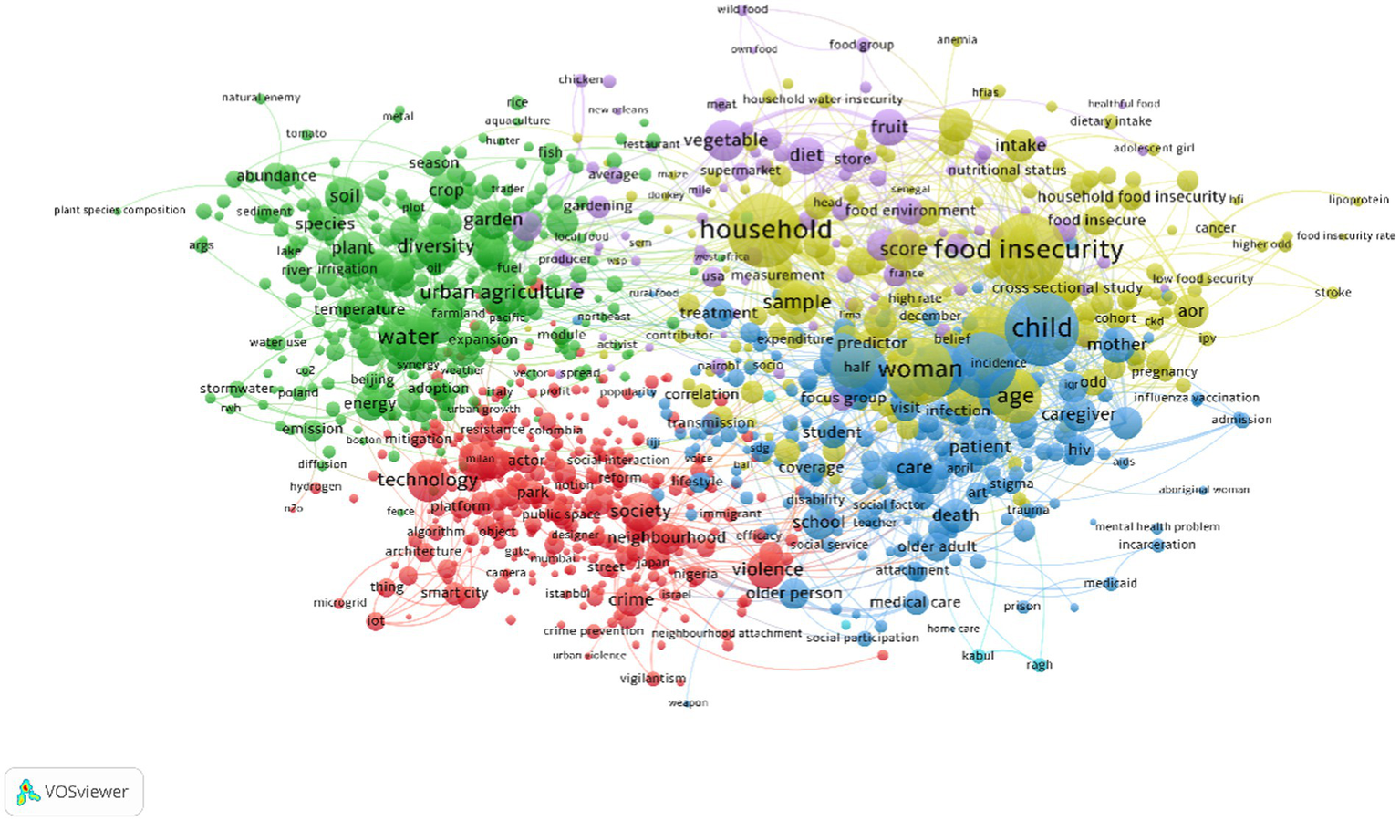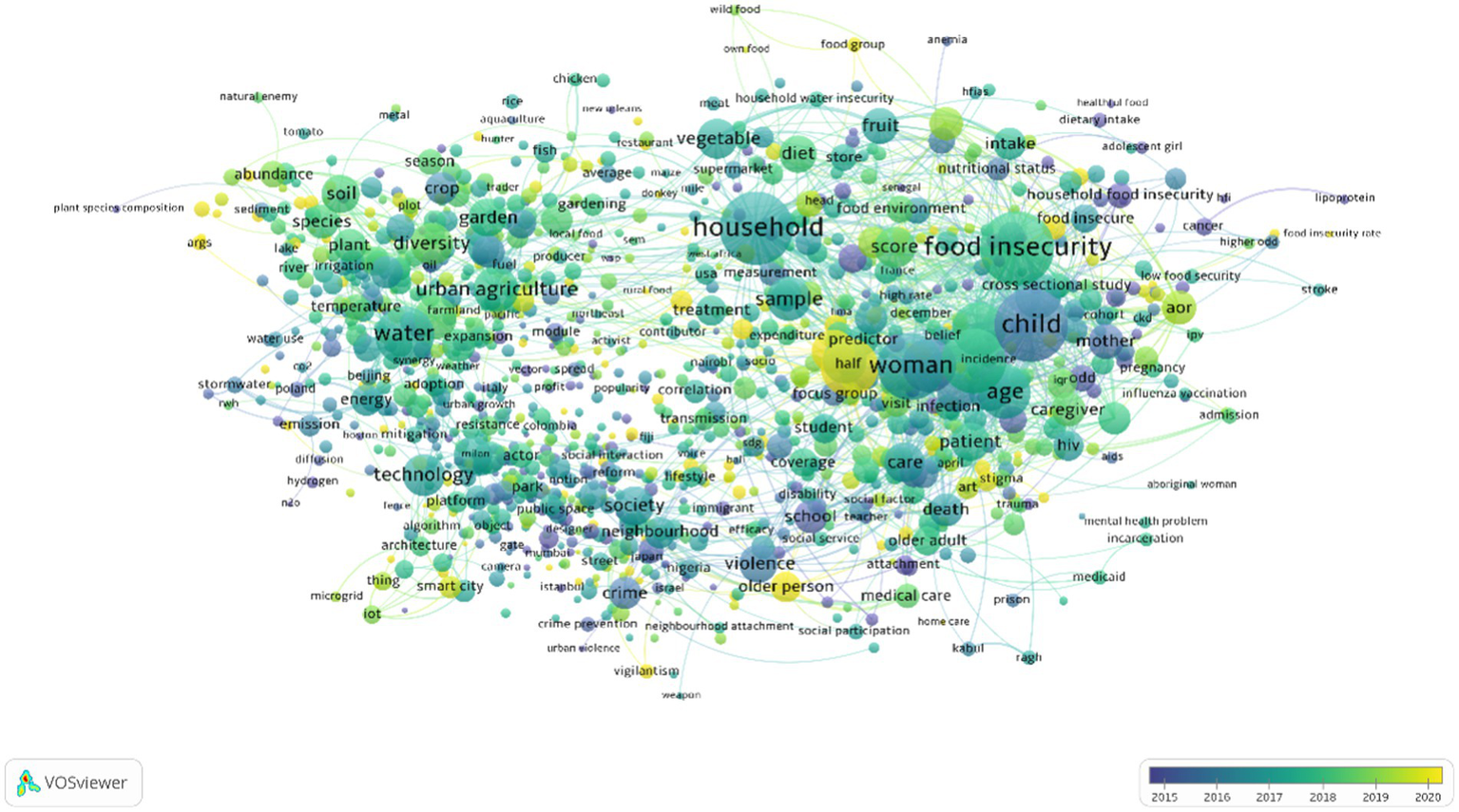 This article further conducts keyword and topic analysis on 2,755 core papers, using VOSviewer to cluster keywords in article titles and abstracts, as shown in Figure 2. Through the analysis of the most frequently occurring topic clusters in related urban community security research, the main research themes include food safety, dietary health, drinking water safety, human health, agriculture, business environment, temperature and climate, geographical environment, infectious diseases, child health, women’s health, social factors, healthcare, international migration, technological development, and social crime, among others. These keywords reflect the extensive diversity of urban community security research, encompassing various aspects from social factors to environmental issues. Additionally, topics like social inequality, environmental sustainability, and urban planning strategies (Salmistu and Kotval, 2023) are also closely examined by researchers, underscoring the complexity of urban community security research. In general, the hot topics and key issues in urban community security research revolve around areas such as cities, agriculture, social aspects, family dynamics, food security, vulnerable populations (including women and children), and health-related matters. The change in the research theme of urban community security in recent years is shown in Figure 3, recent articles have focused on research themes related to climate change (Banwell et al., 2018; Tomatis et al., 2023), population aging (Ma and Xu, 2023), food security (Steenkamp et al., 2021; Yazew et al., 2023), and the impact of COVID-19 on urban sustainability (Robillard et al., 2023), among other pertinent urban community security concerns (Prashar et al., 2013). Analyzing the hot topics and research trends in urban community security research, we can summarize several scientific patterns and research priorities: (1) interdisciplinary research: urban community security research is inherently interdisciplinary, encompassing fields such as urban planning, agriculture, sociology, family studies, food security, vulnerable populations, and health. Researchers increasingly recognize the need to comprehensively consider various factors and knowledge from across these disciplines to address urban community security issues. (2) Addressing current challenges: in recent years, urban community security research has placed a heightened focus on addressing contemporary global challenges, including climate change, population aging, food security, and the effects of COVID-19. This reflects a tendency among researchers to prioritize urgent issues with broad societal impacts. (3) Social equity and vulnerable groups: urban community security research underscores the importance of social equity and vulnerable populations. This includes a focus on women, children, and other groups susceptible to the impacts of social insecurities, aiming to ensure that security strategies are inclusive and equitable. (4) Sustainable development: sustainable development is a key research focus, especially concerning the future of urban communities (Tang et al., 2023). Researchers are dedicated to identifying sustainable solutions that enhance urban community security, including topics like low-carbon development (Zhang et al., 2023), clean energy, and related subjects, to ensure the long-term well-being of society and the environment. (5) Timeliness and practicality: the distribution of publication dates highlights researchers’ attention to timeliness and practicality. They not only concentrate on theoretical research but also prioritize studies with the potential to directly influence policymaking and community practices. In summary, urban community security research trends are characterized by their comprehensiveness, interdisciplinary nature, and practical orientation. The field addresses pressing societal and environmental challenges while striving to improve the sustainability, inclusivity, and security of urban communities. This development contributes to enhancing security measures in cities and communities and drives progress in related policies and practices.