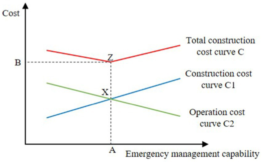 In order to improve the government emergency management capability, it is necessary to increase the investment in system construction accordingly. Therefore, the construction cost of urban resilient community security system is positively correlated with the government emergency management capability, as shown in curve C1. Due to the increase in the construction cost of building the security system, the resilience of the security system has been improved, the system has fewer and fewer loopholes, the function has been gradually optimized, and the emergency rescue work efficiency has been continuously enhanced. Correspondingly, the operation cost to ensure the normal operation of the security system has been reduced. Therefore, the operation cost of the security system presents a negative correlation curve with the government emergency management capability, as shown in curve C2. The construction cost and operation cost of the urban community security system constitute the total cost. The relationship between the total cost and the government emergency management capability is shown in curve C. Point X indicates that the construction cost is equal to the operation cost, and the value of its emergency management capability is A, corresponding to point Z on the total cost curve C. At this point, the total cost is the smallest, with a value of B, and the government emergency management capability is the best.