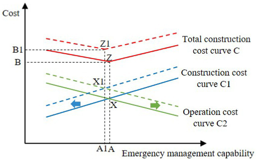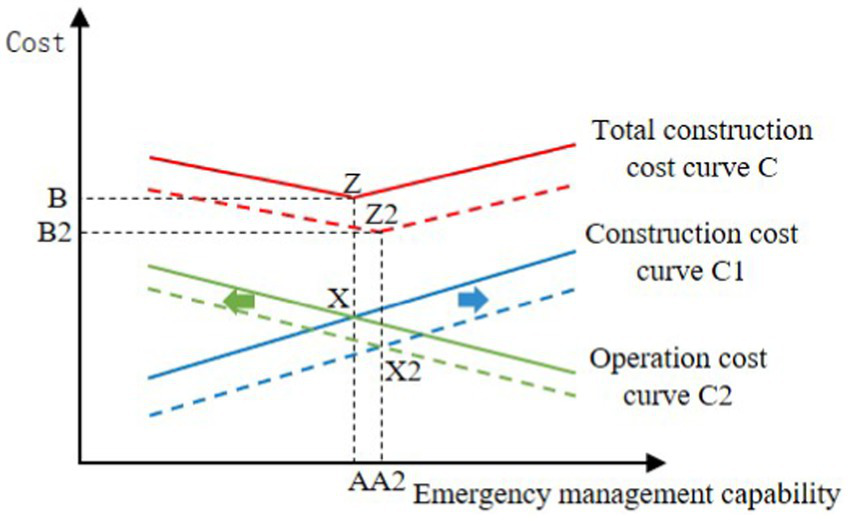 In mode 1, as the government has ignored the impact of technological innovation of the security system on the improvement of emergency management capabilities, and has seriously underinvested in the construction of the security system, the government applies a large number of emergency management resources to enhance emergency management capabilities, resulting in a relatively low utilization rate of emergency management resources. The resilience of the security system is relatively weak. In this mode, the curve C1 in Figure 7 moves to the left, as shown by the arrow. At the same time, the operation cost is increasing, and the curve C2 moves to the right, as shown by the arrow. When the government faces sudden public incidents and adopts the approach of mode 1 to improve its emergency management capability, the construction cost curve and the operation cost curve intersect at a new point X1, and the value of its emergency management capability is A1, which corresponds to point Z1 on the new total cost curve. At this point, the total cost is the smallest, with a value of B1. By comparing Figure 6 with Figure 7, it can be seen that B1 > B, A1 < A, indicating that when facing public emergencies, the Chinese government adopts the approach of mode 1 to improve the government emergency management capability, which not only costs more construction cost and operation cost, but also does not improve the government emergency management capability and rescue efficiency.