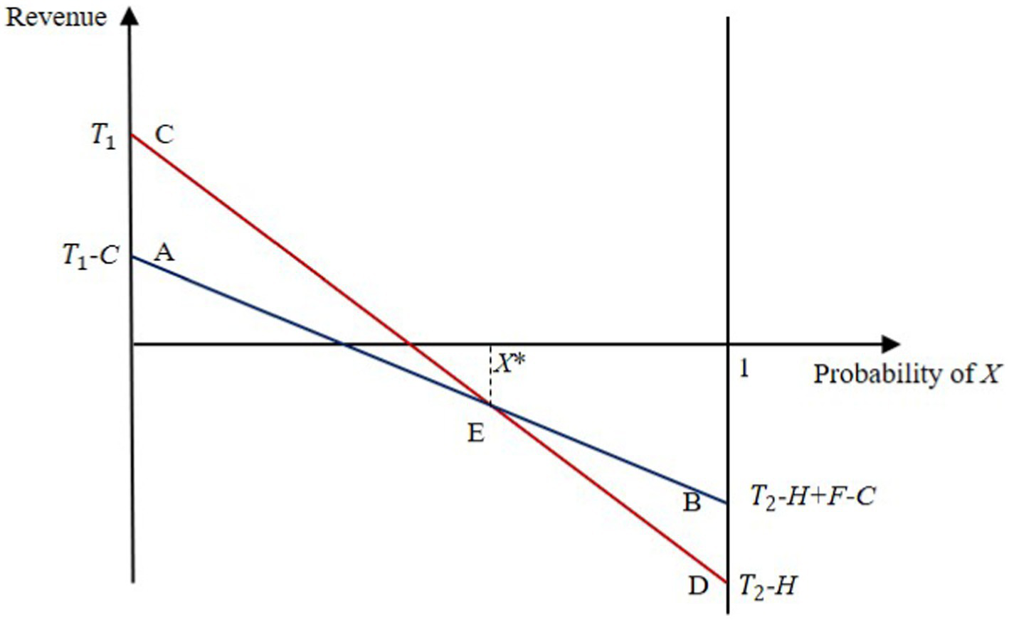 To understand the dynamic relationship between governments and enterprises in the game, and then provide a basis for governments to make decisions to accelerate the participation of enterprises in the construction of the security system, Eq. 4 is simplified as , which describes the relationship between the revenue of the government’s active support and the probability of enterprises not participating in the construction of the security system, represented by line AB in Figure 9. Point A represents the revenue obtained from the government’s active support when enterprises participate in the construction with a probability of 1, which is denoted as . Point B represents the revenue obtained from the government’s active support when enterprises do not participate in the construction, which is denoted as . Similarly, Eq. 4 is organized and transformed into , which describes the relationship between the revenue of the government’s negative support and the probability of enterprises not participating in the construction, represented by the line CD in Figure 9. Point C represents the revenue obtained from the government’s negative support when enterprises participate in the construction, which is denoted as . Point D represents the revenue obtained from the government’s negative support when enterprises do not participate in the construction, which is denoted as . Line AB and line CD intersect at point E, which indicates that the revenue from the government’s active support strategy and negative support is equal, which means that the government reaches the optimal game equilibrium state. Point E corresponds to point X* on the horizontal coordinate, and the corresponding horizontal coordinate value represents the probability of reaching the optimal game state when enterprises do not participate in the construction, and is denoted as C/F. This is shown in Figure 9. According to Figure 9, the balanced process of behavioral strategy selection between the government and enterprise in the construction of the urban community security system can be intuitively understood. Meanwhile, how relevant factors affect the behavioral selection of the government and enterprises in the construction of the urban community security system can be discovered.