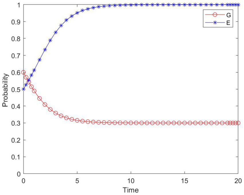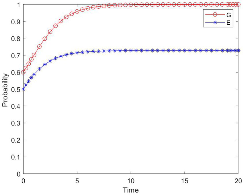 The profit R2 is reduced when the enterprise does not participate in the construction. The game evolution strategies when R2 is set to 2 are shown in Figure 13.