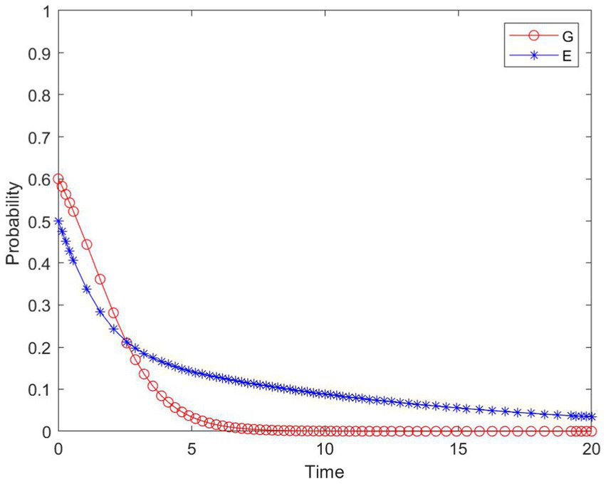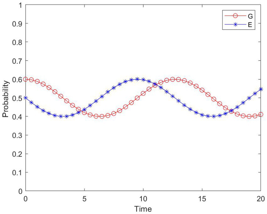 Comparing the simulation results of Figures 10, 12, it can be seen that as the government increases the punishment F for enterprises not participating in construction, the government’s active support revenue increases, leading to the increase of the government’s active support. Consequently, due to the reduced benefits, enterprises will decrease their probability of non-participation in construction. As shown in Figure 12, although the strategies of the government and enterprises show cyclical fluctuations, the average probability of enterprises participating in construction has increased compared with Figure 10, indicating that increasing the punishment for enterprises that do not participate in construction can promote their participation in construction.