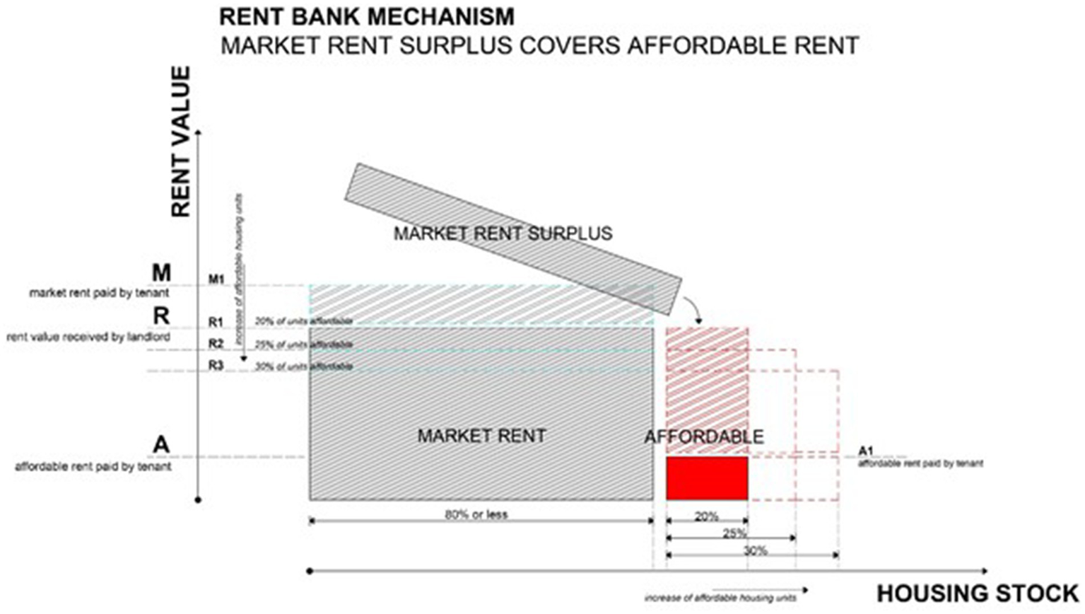 Landlords will be entitled to receive a rent value, denoted as R, which is derived by subtracting a capped percentage (M-R) from the market price rent, M. Conversely, any surplus in market rent above the value R will be redistributed to offset the lower value, A, associated with affordable rent.