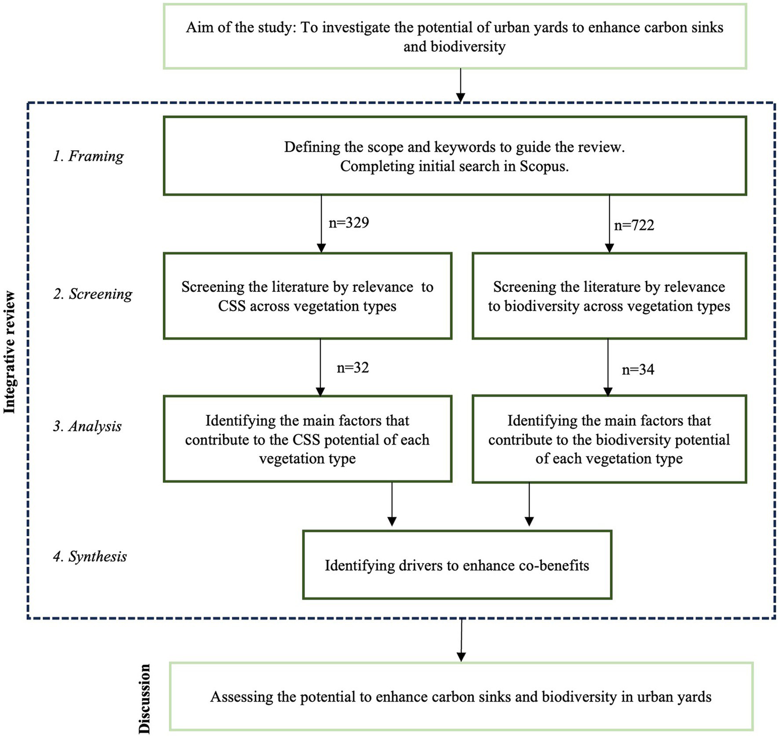 After defining the scope and review questions, searching and screening of literature was conducted by using Scopus. We focused on journal articles published from 2000 until the beginning of 2023 and written in English. The search was limited within titles, abstracts and keywords, and was completed separately for the two research themes, biodiversity and carbon, using search strings such as ‘theme’ AND ´vegetation type’ AND ‘residential’ OR ‘garden’ OR ‘courtyard’ OR ‘yard’ AND ‘urban.’ Vegetation types searched were as follows: tree, shrub, hedge, climber, lawn, grass, perennial, meadow, green roof, vegetated roof, garden plot and urban farming.