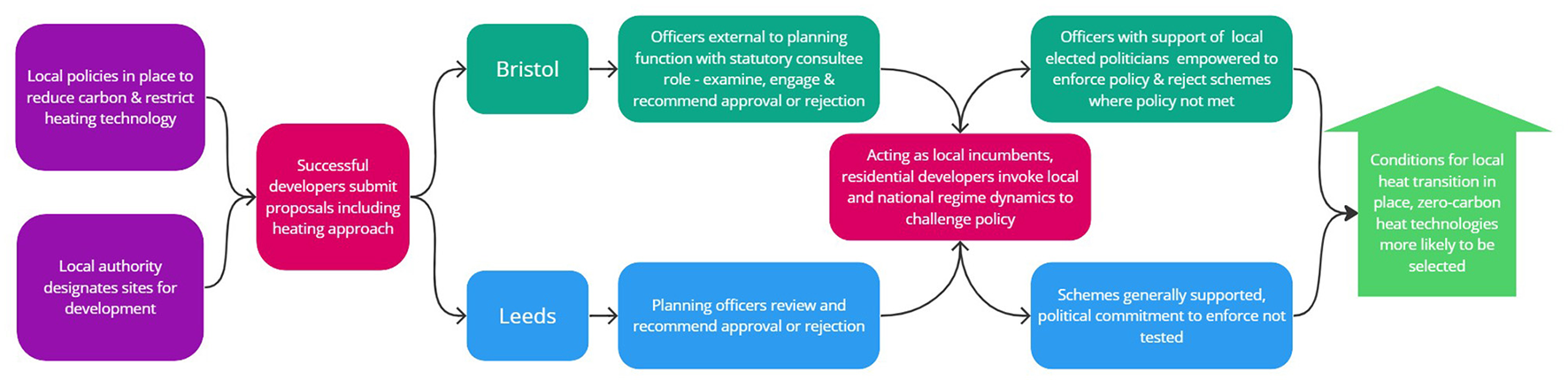 Section 2 establishes the socio-technical transitions literature that underpins the analysis in this study. Section 3 details the methods used to address the research question through an embedded case study of two large UK cities across a sample of 30 residential developments. Section 4 presents the results of the case study, which finds that through implementing a set of local conditions, LAs can successfully shape the local domestic heat regime and encourage developers to choose LZC heating in their projects. Section 5 further discusses the implications of the findings on the potential for LAs to shape heat decarbonisation in their area. Section 6 concludes and outlines how the findings, whilst being UK-focused, could still be applied wherever local state actors seek to encourage private developers to install low-carbon technology.