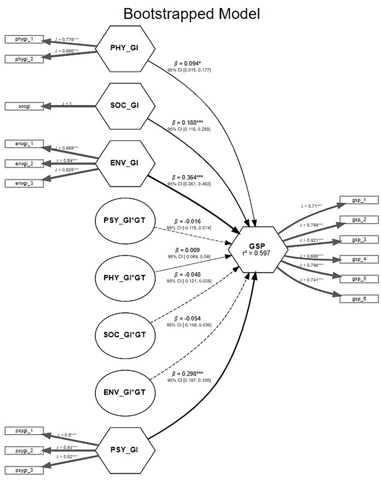 Question 1: Does a significant influential relationship exist between GI and GSP? If so, which attributes among the four factors of GI - psychological, physical, social, and environmental - demonstrate greater significance?