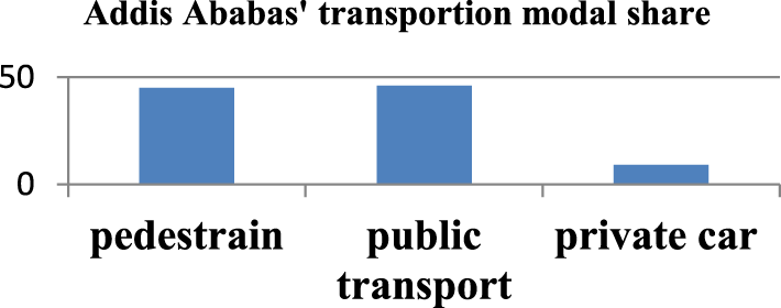 With an estimated population of 84.7 million inhabitants in 2011, Ethiopia is the second most populous country in Africa, after Nigeria. Nevertheless, it has a relatively low urbanization rate of 17%, making it one of the least urbanized countries in Africa, ranking only above Burundi (10.9%), Malawi (15.7%), and Uganda (15.6%). According to the World Bank group in 2015, urbanization in Ethiopia is experiencing rapid growth, making it one of the fastest in the world. Urban infrastructures become strained as a result of the rapid growth of urbanization. These stresses also impact urban transport by increasing the demand for it. Addis Ababa faces a challenge with urban mobility. Mobility refers to the capacity for individuals and goods to travel swiftly, effortlessly, and inexpensively to their intended destinations, maintaining a level of speed that reflects unhindered movement or similarly excellent conditions (NCHRP report 398, 1997). Urban mobility refers to the capacity to transport individuals and commodities within a city. Motorized transport is the primary mode of urban mobility in Addis Ababa, accounting for 55% of the city's total modal share. According to the AACPPO report from 2012, the city's modal share in 2006 was approximately 45% for pedestrians, 46% for public transport, and 9% for private modes- refer to Figure 1 for visual representation. Traffic congestion and road traffic accidents have an impact on the mobility of individuals and the transportation of goods. The current urban transport system exhibits a high incidence of traffic accidents, significant traffic congestion, adverse environmental effects, inadequate safety measures in public transport, and limited accessibility (Bogale, 2012).
