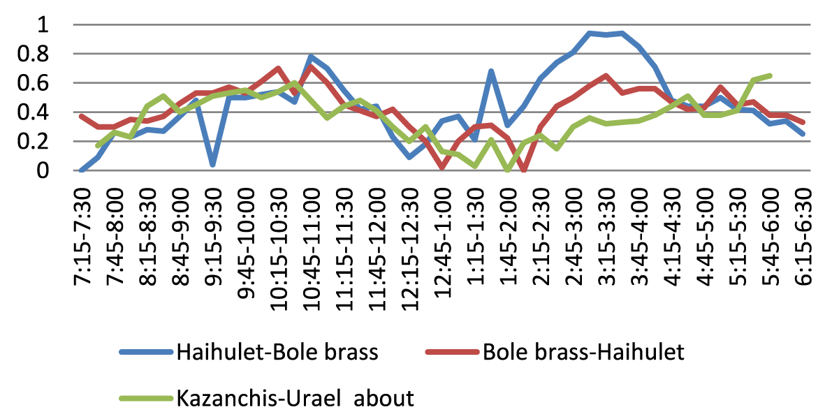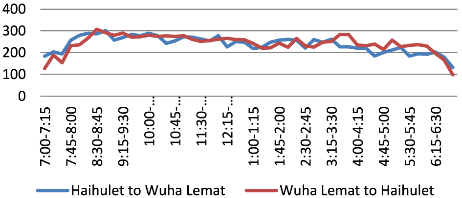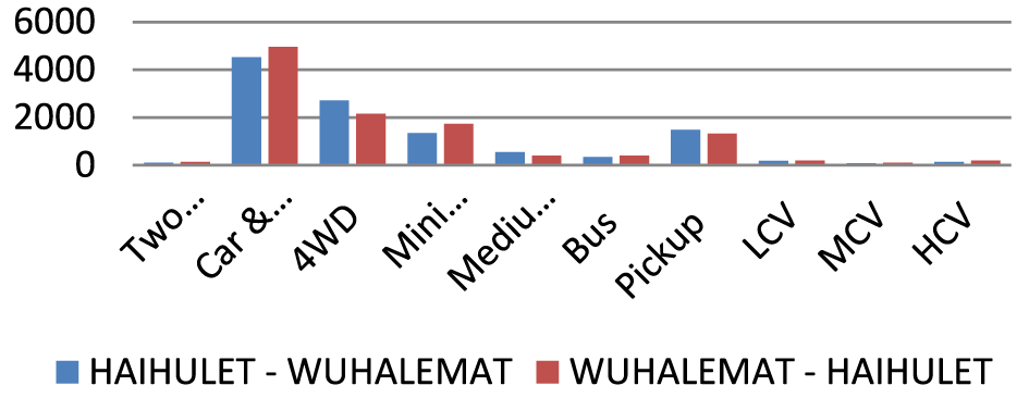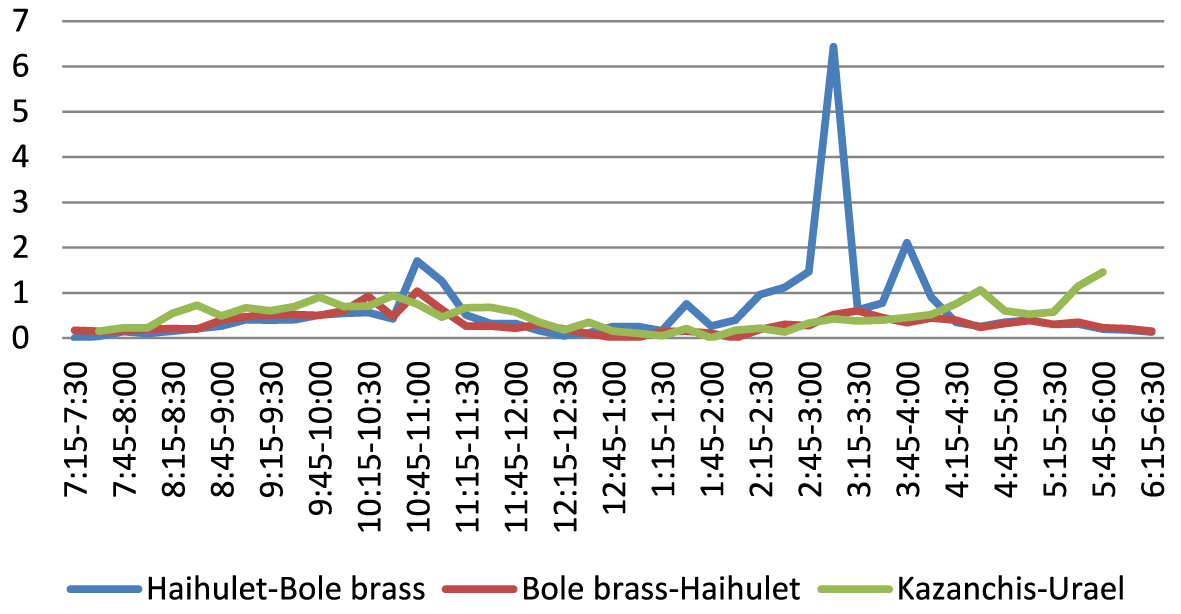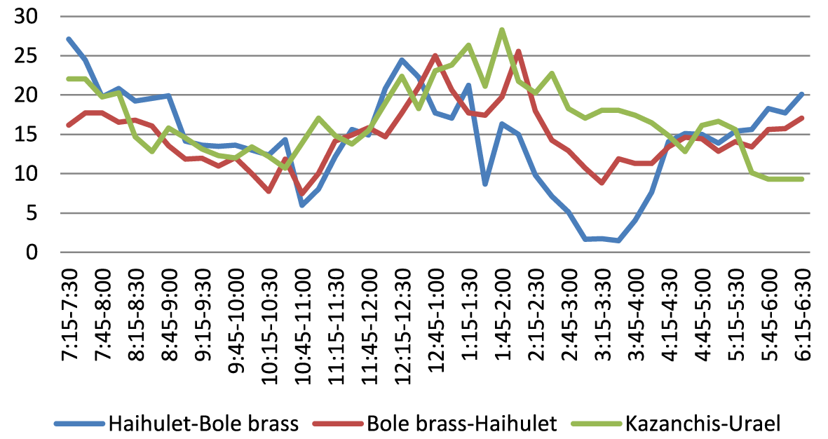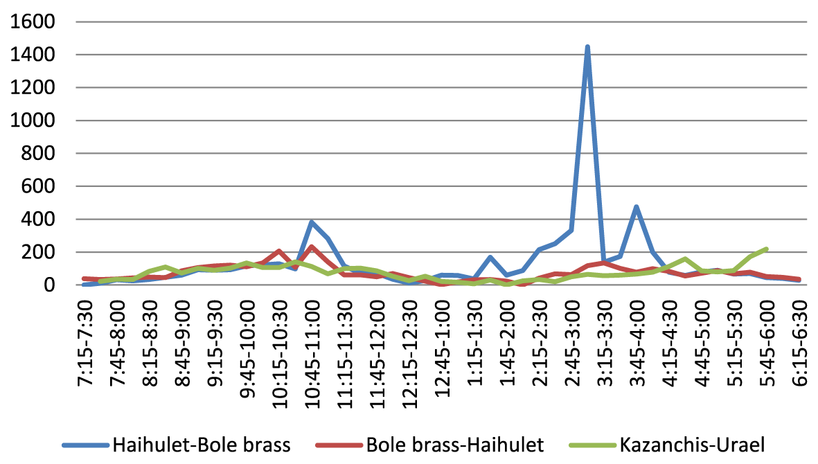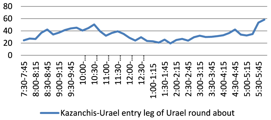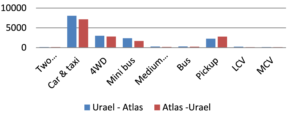 The Urael-Atlas road experiences daily active traffic that begins in the morning and persists throughout the day. The collected data indicates that the traffic volume in both directions (from Urael to Atlas and from Atlas to Urael) is relatively similar. The average traffic volume in the direction from Atlas to Urael is 1275 vehicles per hour, while the average traffic volume in the direction from Urael to Atlas is 1,408 vehicles per hour. The Urael-Atlas direction experiences a significant increase in traffic during the time interval of 9:00–10:00, with a recorded volume of 1,528 vehicles per hour. This hourly traffic volume represents the highest level of traffic for both directions. The Urael-atlas and Atlas-Urael direction experience the lowest traffic volume during the morning hours from 7:00 to 8:00 and in the evening from 6:00 to 7:00. Please refer to Table 4, Figure 3 for more details. During these time intervals, the directional traffic volume is decreasing. The Urael—Atlas directional volume experiences a higher influx of vehicles compared to the opposite direction. Based on the raw data, the daily volume of vehicles traveling in the Urael–Atlas direction is 16,901 vehicles per 12-h period. According to Figure 15, there is an increase in both directional flows during the morning. However, during the evening period, the volume decreases.