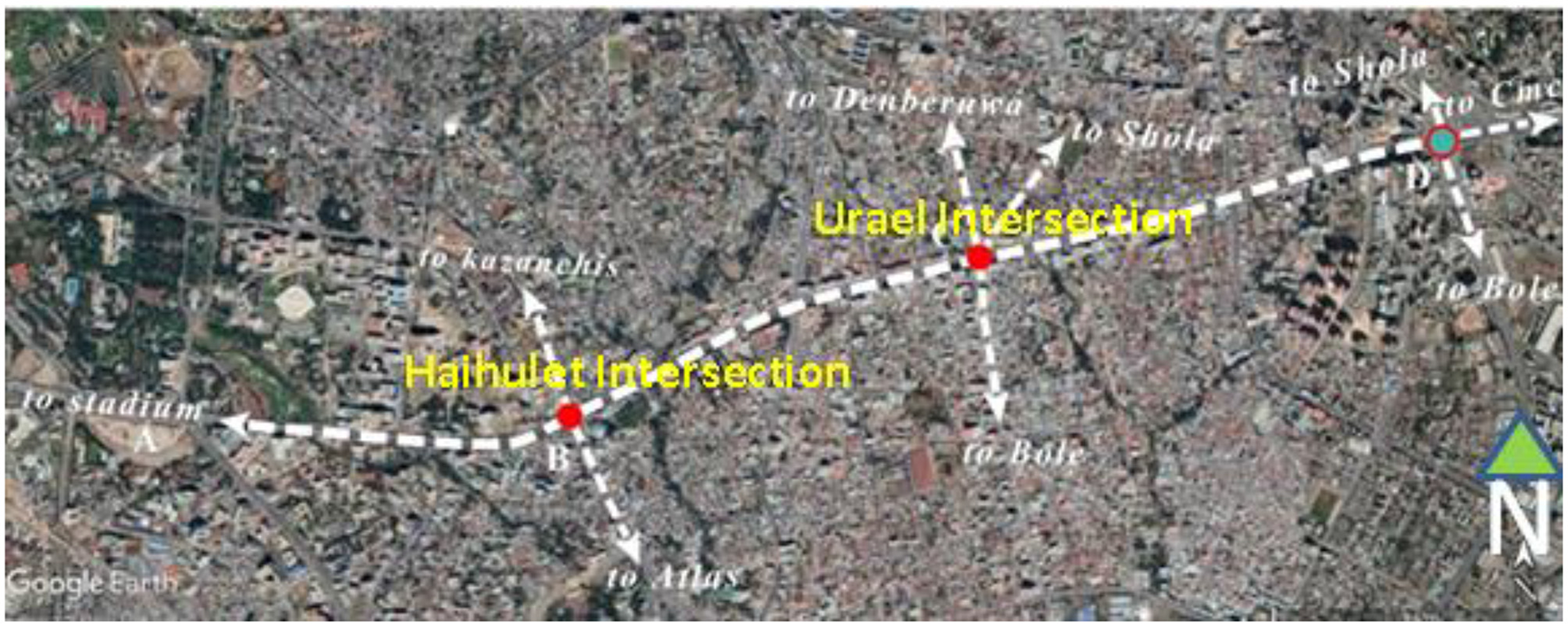 There are several intersections in the area that experience complicated traffic congestion due to high mobility. However, this research specifically focuses on two major intersections, Urael and Haihulet Junctions, which have larger traffic jam complexes. These intersections require technical solutions, as no previous research has been conducted to measure the level of traffic congestion and address the associated problems. The selected intersections are heavily trafficked in the urban environment and have a greater negative impact on city residents compared to other intersections and junctions. Additionally, they serve as important economic nodes for the city. Both Urael and Haihulet junctions have four entry approaches. The Urael junction approaches include Meskel Square, Atlas Hotel, Kazanchis, and “Wuhalemat”. The Haihulet junction approaches include “Wuhalemat,” Bole Bras, Lem Hotel, and the British Embassy.