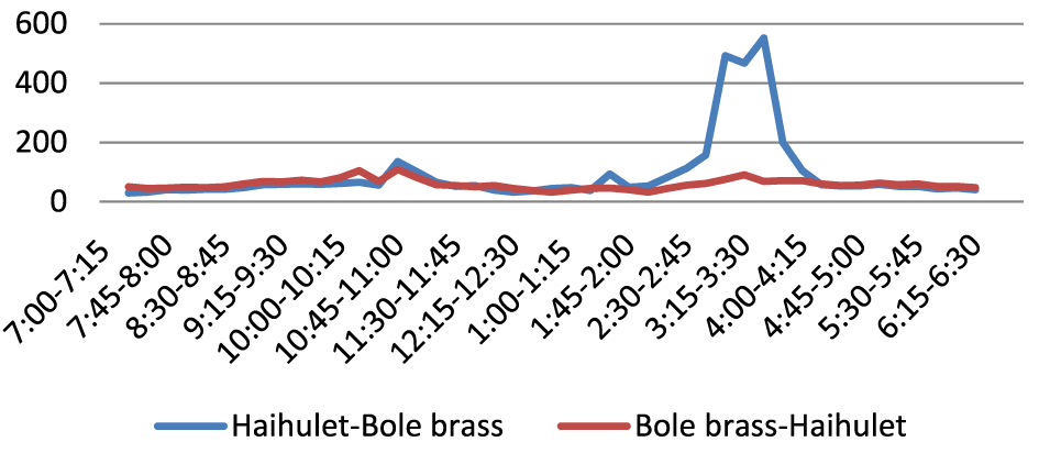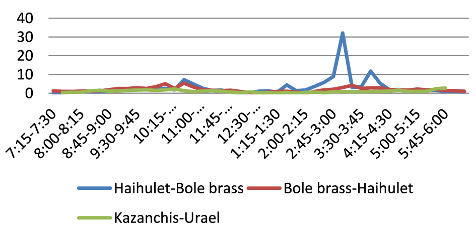 A unidirectional traffic flow is implemented for a continuous 12-h period, with measurements taken at 15-min intervals, at two specific mid-blocks: Urael-Atlas and Haihulet-Wuhalemat. The traffic flow is monitored in both directions at these locations. This unequivocally illustrates that Traffic Congestion poses a significant menace to road transport and represents a primary obstacle for transport policy at all levels. The economic impact of traffic congestion in Addis Ababa is estimated to be approximately 25% of the city's Gross Domestic Product (GDP). As a result, addressing and reducing congestion is the primary focus of various infrastructure projects, traffic management initiatives, and road pricing strategies. Measuring congestion is complex because traffic is not evenly distributed in time and space.
