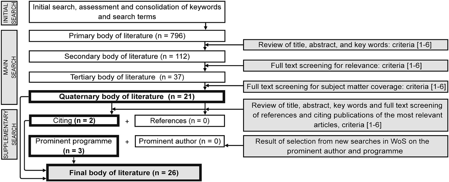 The review of titles, abstracts, and keywords using the above-mentioned criteria (Table 2 from #1 to #6) allowed to select 112 out of 796 articles (Figure 1). Subsequently, screening the full texts of the articles resulted in the selection of 37 articles, and the appraisal of the articles in terms of sufficiency of relevant content resulted in the selection of 21 articles. The latter entailed a thorough review to assess whether each article contained relevant data aligned with the objectives of this literature review. More specifically, examining the depth and breadth of content was undertaken to ensure that selected articles offer comprehensive insights into the capacity building topic. The chosen articles fully or partially (chapter or paragraph) covered the capacity building topic. Therefore, the aim was to ensure the selected articles met inclusion criteria and contributed significantly to the overall understanding of the subject. In addition, the supplementary search (Okoli, 2015), referred to also as “snowballing” (Wee and Banister, 2016), was conducted to review articles not included in the final search of the WoS and with the aim of identifying other pertinent articles that either deepened the current understanding or covered new aspects of capacity building. Therefore, a process of a “backward search” (Levy and Ellis, 2006) was performed, revising the references of the particularly relevant eight articles from the primary body of 21 articles for this literature review. Furthermore, a “forward search” (Levy and Ellis, 2006) was carried out to identify articles that have since cited the most relevant eight articles. This process resulted in the selection of one article. Additionally, new searches were performed in the WoS for a prominent author, specifically Ziervogel Gina and a prominent programme, namely Asian Cities Climate Change Resilience Network (ACCCRN), which yielded 4 relevant articles. Therefore, a total of 26 studies were included in this literature review, as listed in Table 3.