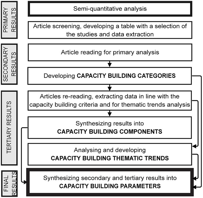 Further, the review included a comprehensive qualitative analysis and synthesis of the final 26 articles (Table 3), conducted in several stages (Figure 2). Based on the review of the articles, the first stage resulted in formulating Capacity Building Categories with an Excel matrix to compile relevant data systematically. The Capacity Building Categories revealed the distinctions and commonalities in how capacity building is famed and approached. The categories determined the authors, the variety of capacity building purposes or issues they addressed, the actors targeted and involved, and the type of processes executed, among other criteria. Subsequently, the further review of the articles was undertaken to extract and analyse information based on the established criteria in the Capacity Building Categories, develop Capacity Building Thematic Trends, and expand on the understanding of Capacity Building Components.