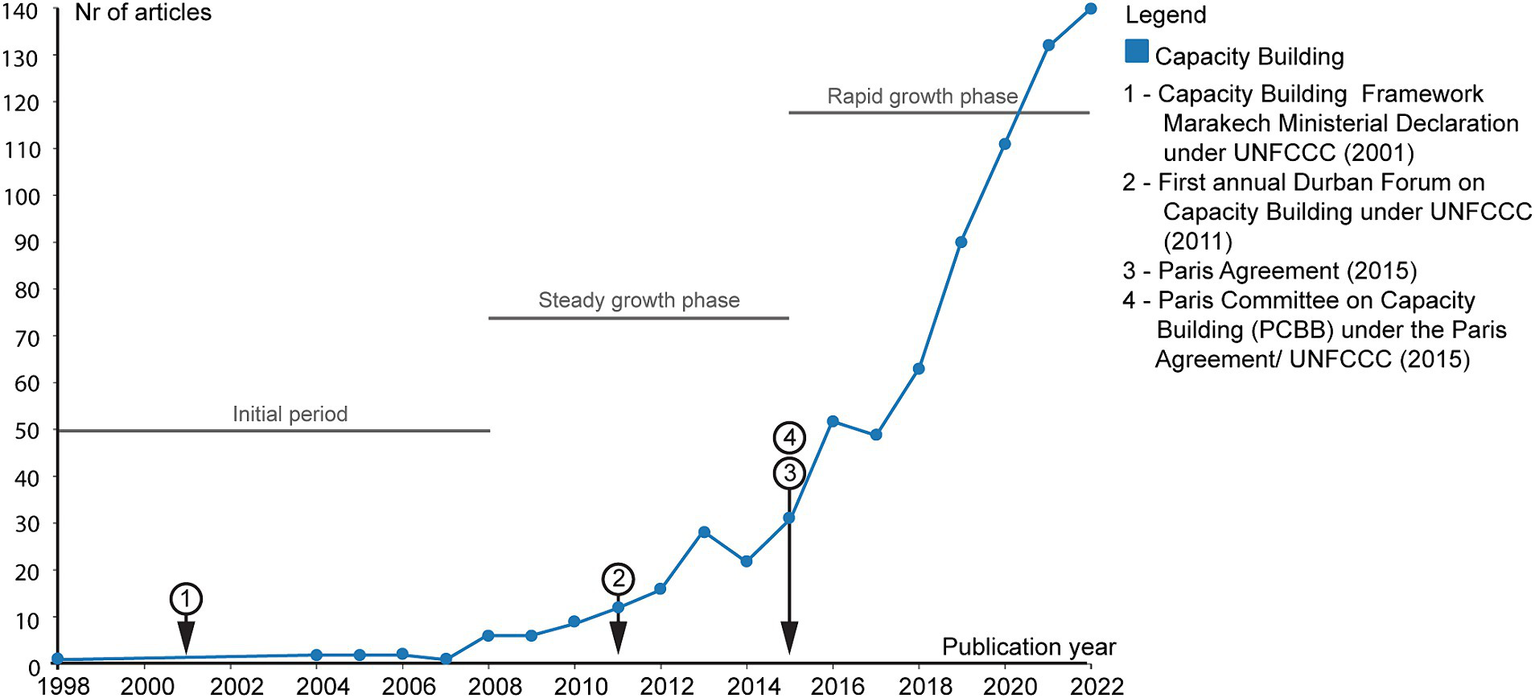 Capacity building for climate actions is becoming increasingly important within the frame of major international policies and treaties at the global level, including the United Nations Framework Convention on Climate Change (UNFCCC). The Marrakesh Ministerial Declaration in 2001 at the 7th Conference of the Parties (COP 7) of the UNFCCC launched two frameworks addressing the needs, conditions, and priorities for capacity building in developing countries and countries with economies in transition (UNFCCC, 2002). In 2011, the COP 17 launched the first Durban Forum to share experiences and good practices in building the capacity of developing countries to respond to climate change (UNFCCC, 2012). Capacity building became prominent within the global scene especially since 2015 when COP 21 adopted the Paris Agreement, specifically Article 11, stating that capacity building should increase capacities and abilities of developing countries, to take effective climate change action, facilitate technology development, and enhance aspects of education, training and public awareness (UNFCCC, 2015). COP 21 also established the Paris Committee on Capacity-Building (PCCB) (Ferraz da Silva, 2022; Nautiyal and Klinsky, 2022), which is a mechanism to address current and emerging gaps and needs, in implementing and further enhancing capacity building in developing countries, particularly those that are most vulnerable to the impacts of climate change. The PCCB facilitates the identification of capacity building needs, priorities, and gaps and aims to enhance countries capacities to implement climate actions plans and adapt to climate change effects (UNFCCC, 2016, 2017). Therefore, the PCCB plays a crucial role in helping developing countries build the necessary institutional, technical, and human capacities to meet the Paris Agreement obligations.
