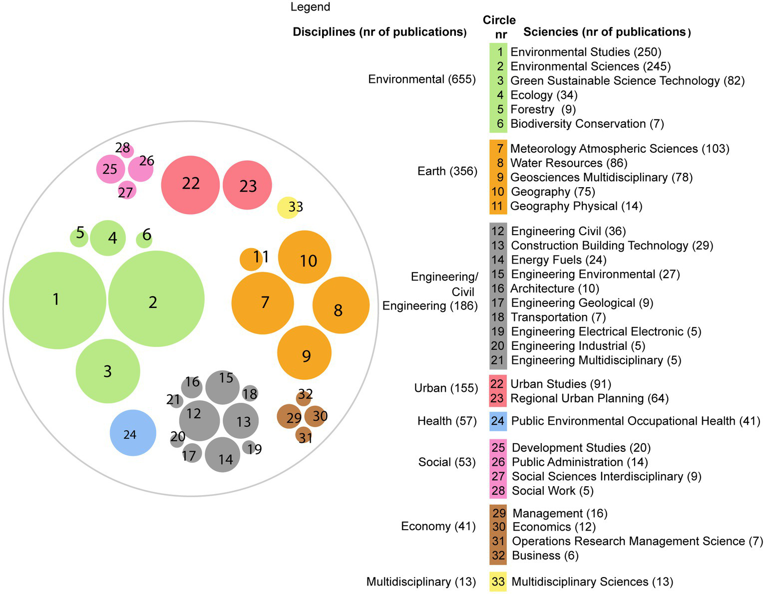 The authors also revised categories of sciences to which publications were classified to determine the type of fields that consider the research on capacity building. The 796 articles were classified by the Web of Science Categories analysis (assigned at the journal level) into different science categories (with some articles classified into more than one category), then grouped by authors into eight major disciplines presented in Figure 5. It is evident that the most significant number of publications on the research subject is reported in the disciplines of Environment (655) and Earth (186), while Urban discipline is much less represented (155).