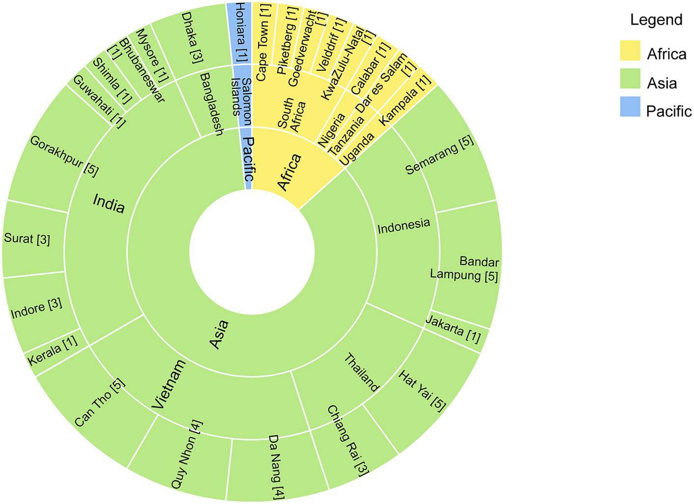 The literature review is based on articles encompassing both theoretical frameworks and specific case studies. In the 26 selected articles, there were 26 reported case studies (Figure 6); each being a city, a subject to research and some cities were researched more than once. Most cities (seventeen) reported in the articles are in Asia and a mostly part of the Asian Cities Climate Change Resilience Network (ACCCRN) programme, across Indonesia, Thailand, Vietnam, India, and Bangladesh. This concentration of Asian cities in research is related to the active role of ACCCRN as a specific stakeholder network in the region. Further, six case studies in Africa included South Africa, Tanzania, Nigeria, and Uganda, while only one case study was reported in Pacific, specifically in Salomon Islands. No case studies were found in Latin America, which might be attributed to several factors.