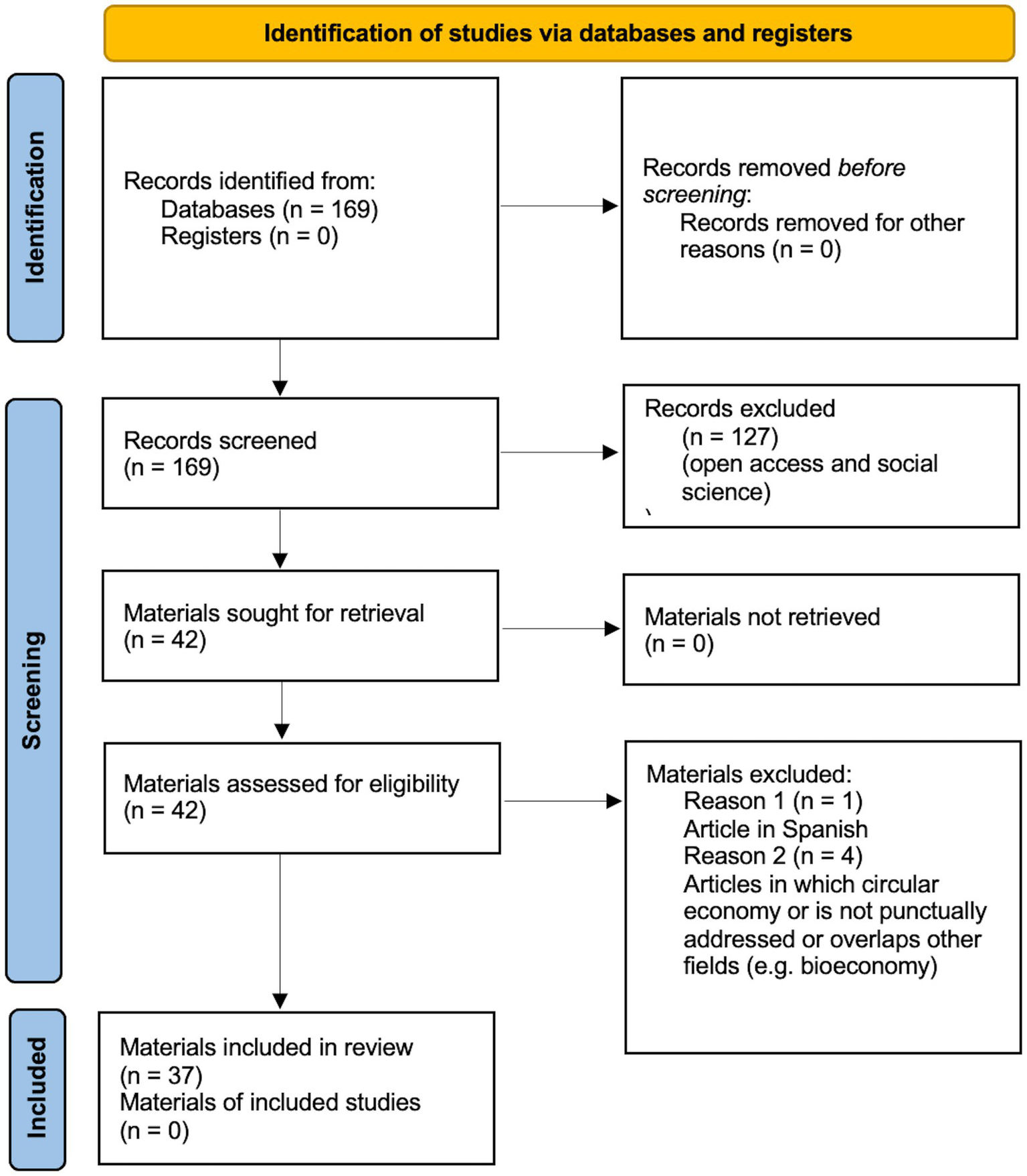 By addressing the presented query, the database returned documents that include, in their title, abstract or keywords, a combination of elements, namely: a reference to CE (either generical or more focused on business modeling), to the R hierarchy, and to the participative dimension of communities. The code provides a limitation of the research, focusing on the social area or subject, as well as Open Access documents. This limitation reduced the available corpus from an amount of 169 to 42 documents, whose abstracts have been screened to assess their pertinence in relation to the scope of the research. Five documents were excluded for the following reasons: one was in Spanish language, while the remaining four did not address CE punctually, or overlapped it with other fields (e.g., bioeconomy, sharing economy). Accordingly, the ultimate corpus for this SLR consists of 37 documents. The process is illustrated in Figure 1.
