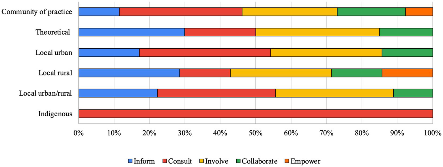 As for the community dimension, the authors chose to focus on its participative dimension in CE experiences. As illustrated by Luigi Bobbio (2019), different classifications apply to the wide concept of participation. While being aware of the non-exhaustiveness of this tool, following Ross et al. (2016), the “spectrum of participation” developed by the International Association for Public Participation (iap2, 2023) (IAP2)3 has been selected as an effective tool to frame different participation experiences for the scope of this paper. Further information about this tool can be found in the next paragraph. The search code also includes a reference to citizen science, meant as an innovative participative dynamic to involve individuals from the civil society in technological and scientific activities that is gaining floor into the CE (Presenti et al., 2020). Finally, the SLR identifies the main actors involved in the participative dynamics, recurring to the quadruple helix model (Carayannis and Campbell, 2009; Carayannis and Campbell, 2010).