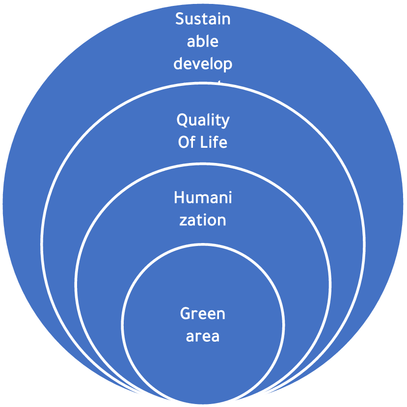 The relationship between green spaces, humanity, sustainability, and quality of life.