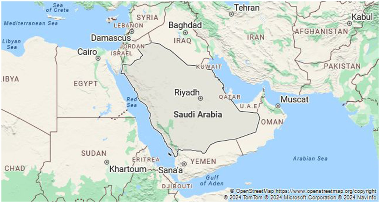 The Kingdom of Saudi Arabia is in the southwestern part of Asia (Figure 2). It shares borders with the Arabian Gulf, United Arab Emirates, and Qatar to the east; the Red Sea to the west; Kuwait, Iraq, and Jordan to the north; and Yemen and Oman to the south.