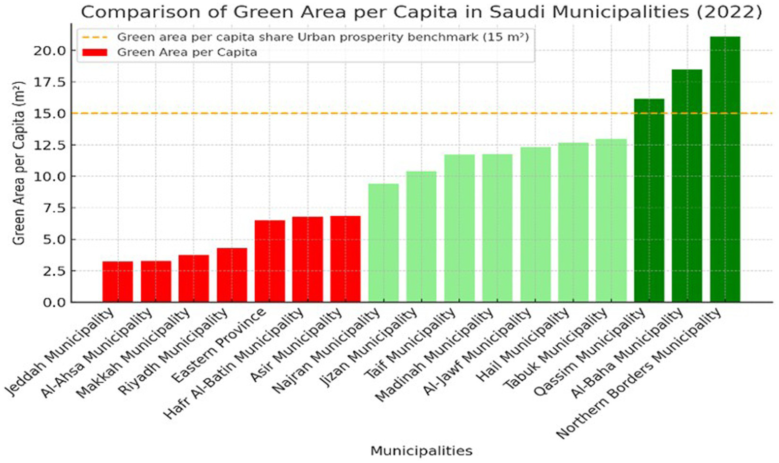 In contrast, the Jeddah Municipality displays the lowest green space per capita (3.21 m2), suggesting a moderate role in enhancing urban prosperity through its generous green spaces.