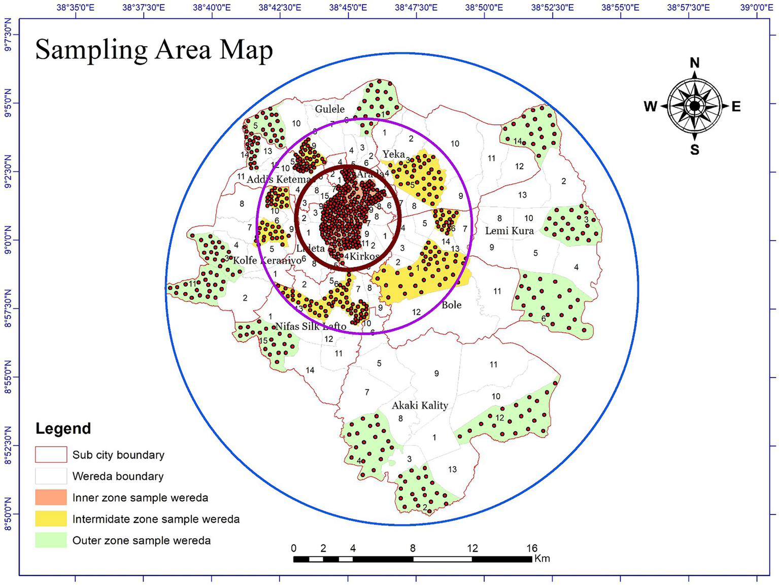 A total of 720 adult-aged sample household representatives constituted the sample for the actual survey. Combinations of stratified, systematic, and purposive sampling techniques were used. In the first phase, the target study area was categorized into three distinct geographical zones: inner, intermediate, and outer-suburb zones. Second, 36 administrative Weredas (the lowest administrative level in Addis Ababa) were selected from the three zones, with 12 Weredas for each zone considering the geographical variations, as shown in Figure 3.