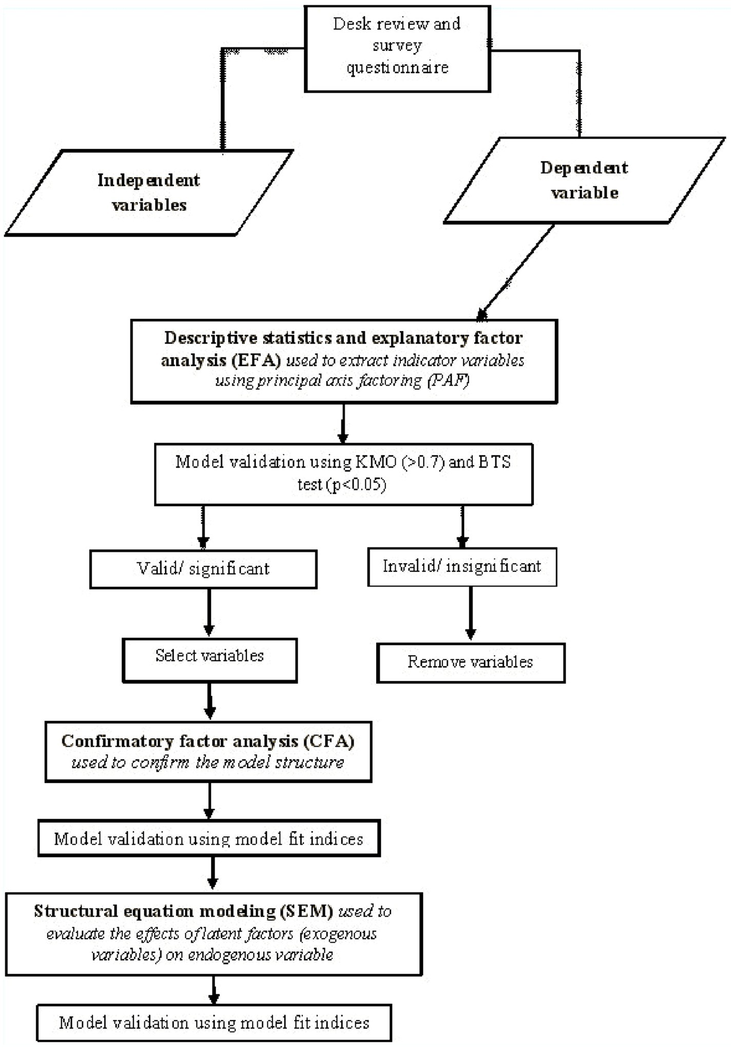 The study employed exploratory factor analysis (EFA), confirmatory factor analysis (CFA), and structural equation modeling (SEM) with the help of Statistical Package for Social Science (SPSS) (version 26) and Analysis Moment Structures (AMOS) (version 26) software. SEM was preferred over regression models due to the complexity involved in using multiple observed indicators of each of the factor constructs to the model of intention to adopt sustainable modes of transport. SEM allows complex phenomena to be statistically modeled and tested to examine the validity and reliability of the observed model parameters (Lomax, 2018).