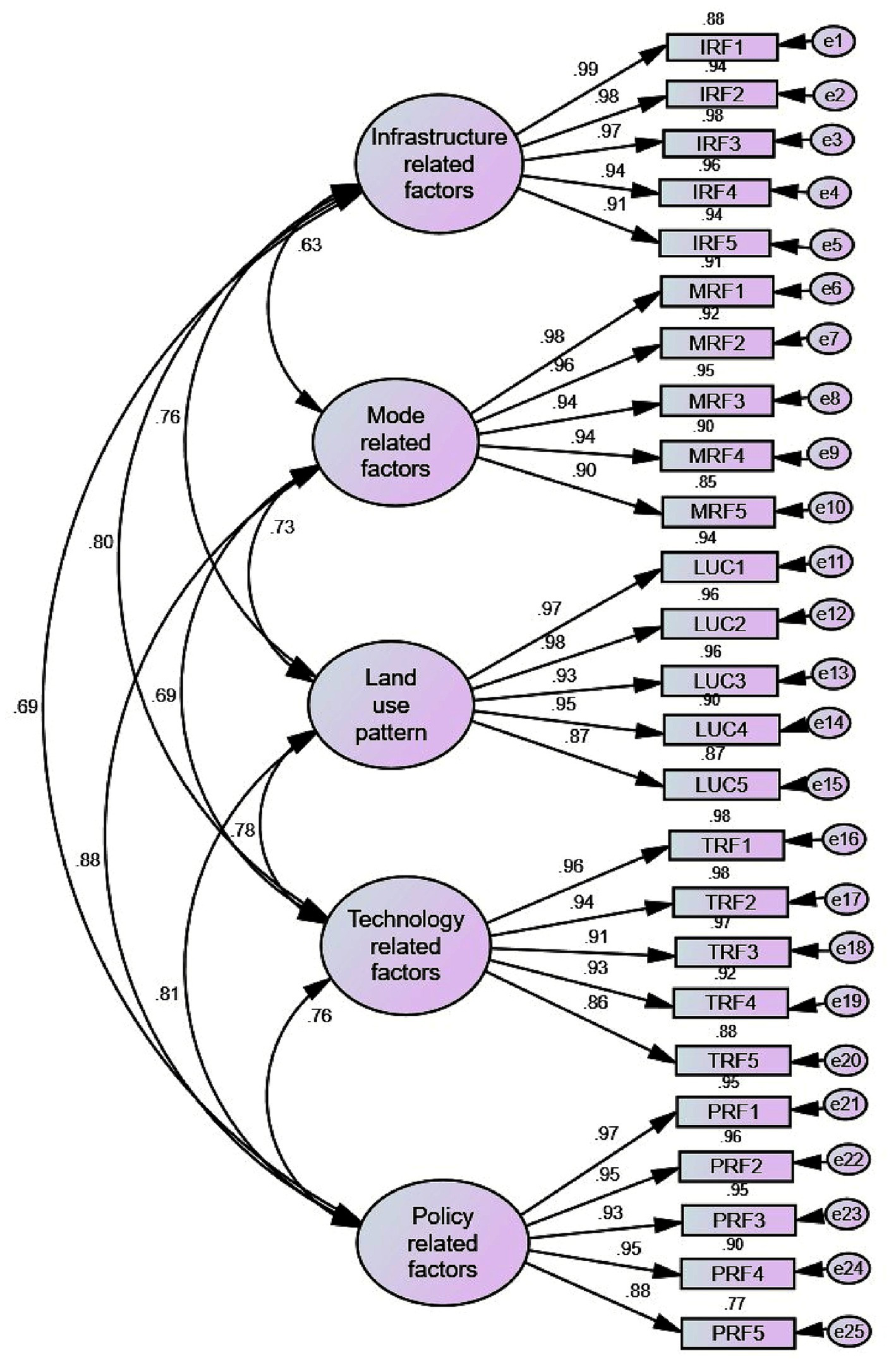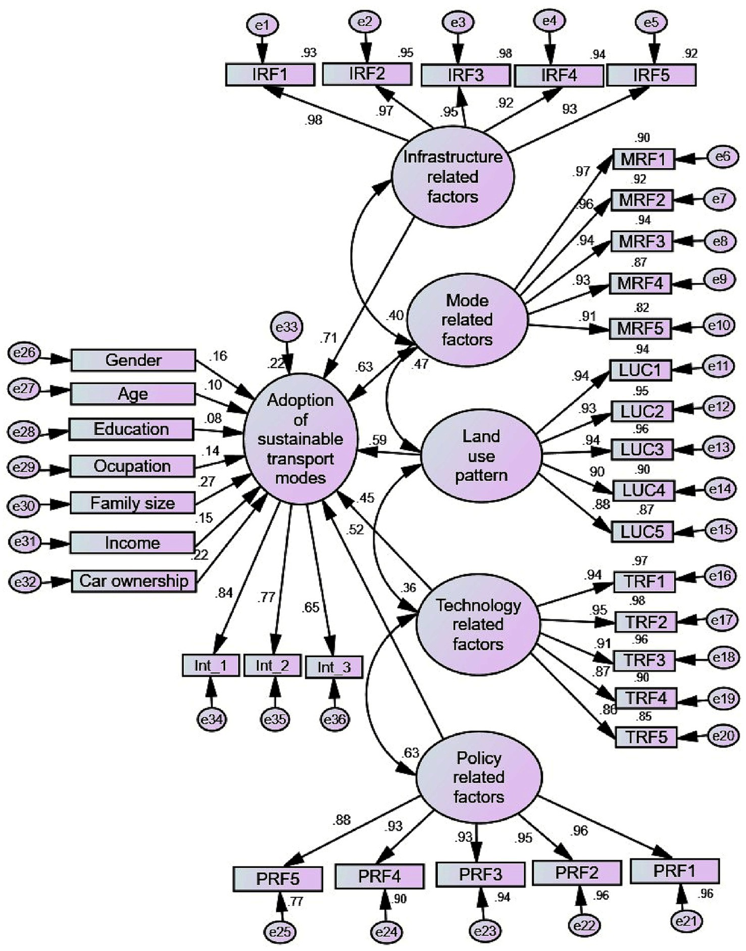 The analysis was performed in three phases. First, the EFA was conducted to extract the observed indicator variables using principal axis factoring (PAF). A factor loading of 0.50 or higher, indicating 25% of the variations, was considered (Hair et al., 2021). The Kaiser–Meyer–Olkin (KMO) test was also used to assess sample size adequacy, with a factor analysis condition between 0.5 and 1 (Bartlett et al., 2001). Additionally, the Bartlett’s test of sphericity (BTS) result was sufficiently large and significant at p < 0.01. Second, a confirmatory factor analysis (CFA) was conducted to confirm the model structure. Since the data were normally distributed, the maximum likelihood (ML) method was used to estimate the parameters identified by the CFA. The observed indicator variables’ contribution to each latent construct was assessed using squared multiple correlations (SMC), where a strong relationship between these indicators and the underlying construct is statistically significant (if p < 0.05). Furthermore, the degree of model fitness between the CFA model and the observation data measurement model was assessed using indices such as standardized root mean square residual (SRMR) and root mean square error of approximation (RMSEA), both expected to be less than 0.08 (Hooper et al., 2008). Additionally, an appropriate model fit is shown by the comparative fit index (CFI), normed fit index (NFI), parsimonious goodness of suitable index (PGFI), adjusted goodness of fit index, and goodness of fit index (GFI), all of which are expected to be greater than 0.90 (Ibid). It was found that the five latent factor constructs: infrastructure condition, mode attribute, land use parameters, policy, and technology-related factors linked with respective observed indicator variables extracted in the EEA. Third, structural equation modeling (SEM) was used to evaluate the effect of the five latent factors (exogenous variables) and respondents’ socio-demographic characteristics such as gender, age, level of education, occupation, family size, income, and car ownership on the intention to adopt sustainable transport modes to validate the SEM. Like the CFA model evaluation, the model fitness for SEM was validated using indices such as standardized root mean square residual (SRMR) and root mean square error of approximation (RMSEA), both expected to be less than 0.08, and comparative fit index (CFI), normed fit index (NFI), parsimonious goodness of suitable index (PGFI), adjusted goodness of fit index, and goodness of fit index (GFI), all of which are expected to be greater than 0.90 (Ibid). The SMC and regression coefficient were used to estimate the strength of the relationship and the magnitude of the influence of latent factors on the endogenous variable, respectively. The overall methodological flow, starting from the initial desk review to identify context-based factors influencing the intention to adopt various sustainable transportation modes to the final model estimation and validation was presented in Figure 4.