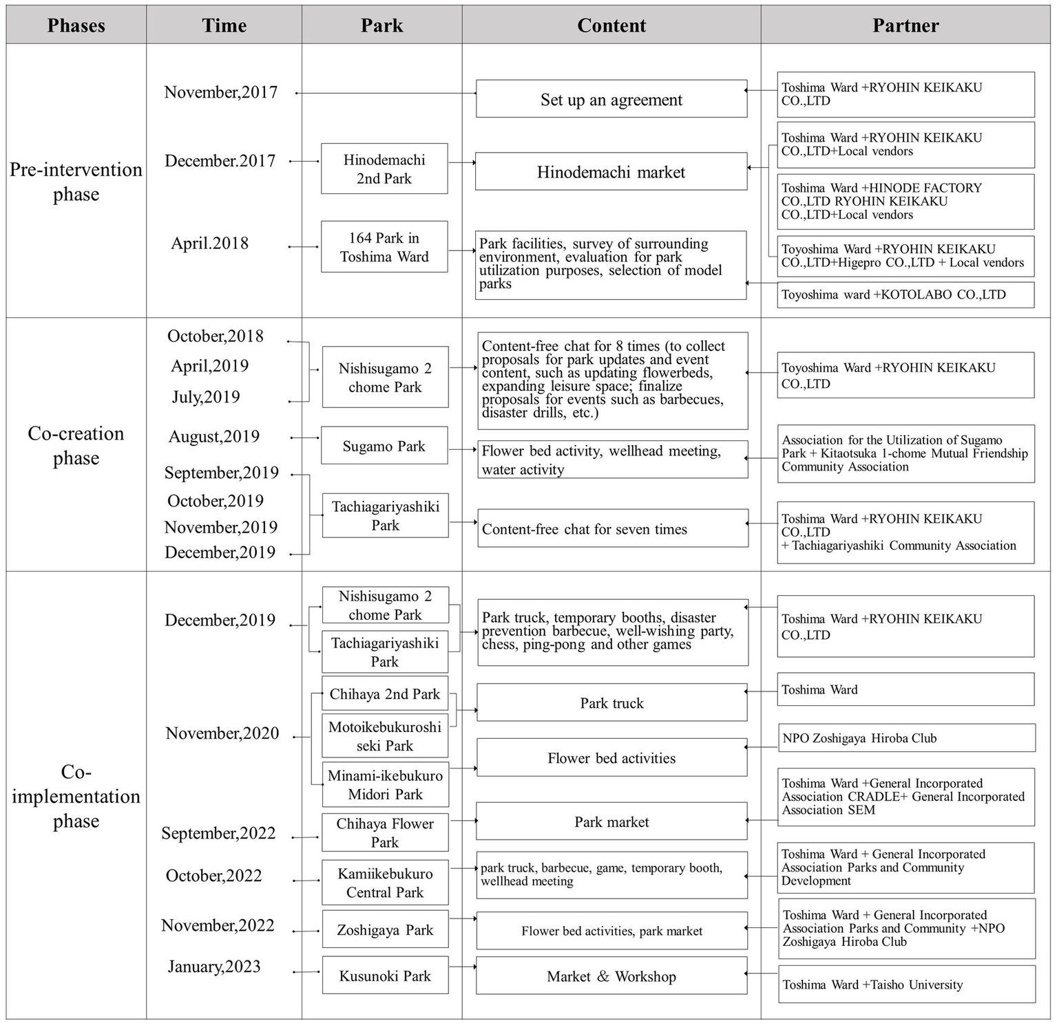 The Japanese experience of sustainable urban green space management through engagement activities began when the Sustainable Development Goals (SDGs) Future City System was established in 2018 (Cabinet Office, 2018). Since then, the revitalization of urban green space has been considered important. Especially the revitalization of community parks, which are the most numerous of the urban parks in Japan. By the end of 2021, there were 98,632 community parks in Japan, an increase of 958 compared with the previous year (Ministry of Land Infrastructure Transport and Tourism, 2022). They were divided into three types: block parks, neighborhood parks, and district parks. Block parks have a standard area of 0.25 ha and a service radius of 250 m; neighborhood parks have a standard area of 2 ha and a service radius of 500 m; and district parks have a standard area of 4 ha and a service radius of 1,000 m (Ministry of Land Infrastructure Transport and Tourism, 2023). To meet the diversified needs of residents for park use, Japanese urban park management is focusing on expanding the support for the activities of residents, non-profit organizations (NPOs), and other groups, rather than maintenance and management of parks by administrations (Ministry of Land Infrastructure Transport and Tourism, 2022).