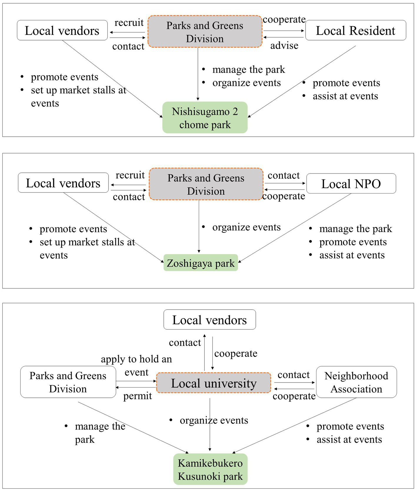 Operation and management relationship of the revitalization of three parks. Red dotted box indicates the main operator.