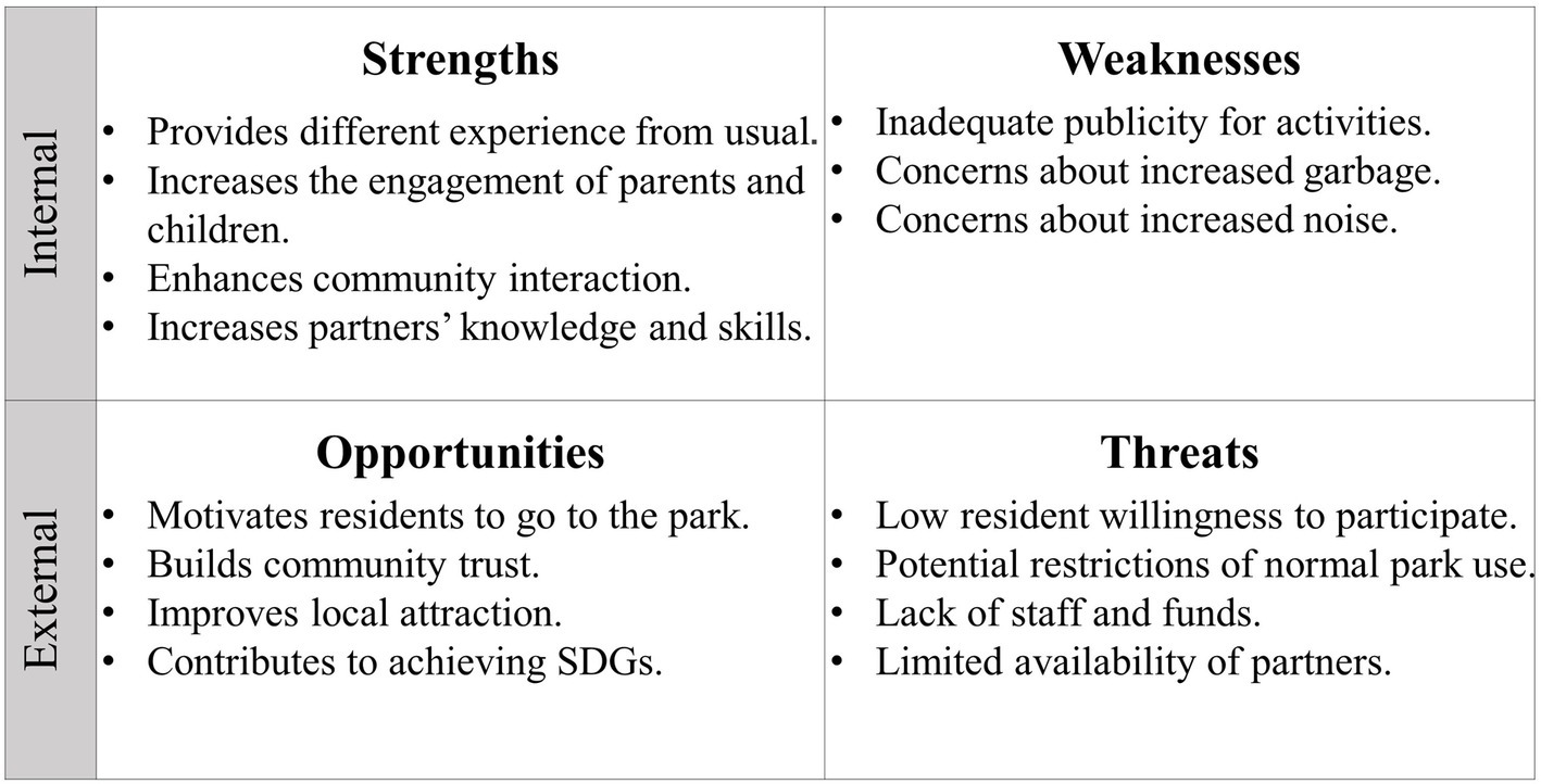 The survey considered different partners’ perceptions of participatory community park revitalization, potential opportunities and contemporary development challenges as well as their worldviews. Alongside this, the in-depth qualitative interviews about opportunities identified five themes, including (1) realize SDGs, (2) improve local attraction, (3) build community trust, (4)expand community business influence, and (5)increase partners’ knowledge and skills.